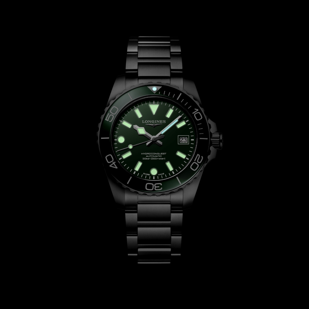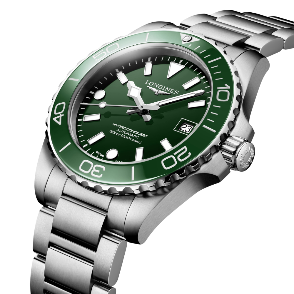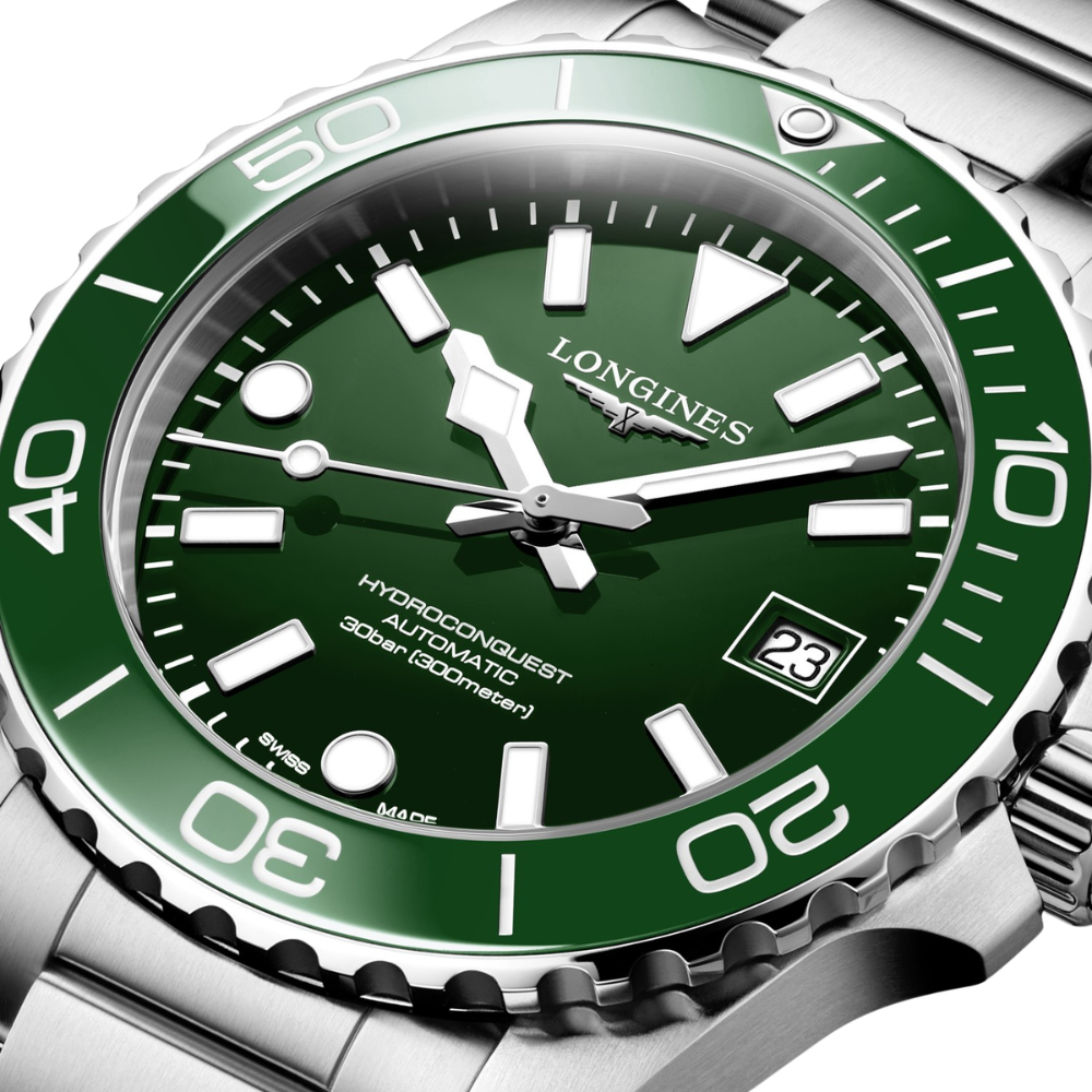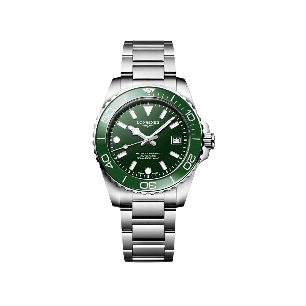 Discover the Longines HYDROCONQUEST L3.779.4.06.6 Watch, manufactured in keeping with tradition for an elegance beyond compare. Made from stainless steel, the case is complemented by a green ceramic unidirectional rotating bezel, delivering exceptional scratch resistance. The green lacquered polished dial enhances the watch’s distinctive character, while applied indexes and silver-polished hands ensure clarity and sophistication. Swiss Super-LumiNova® provides optimal legibility in low-light conditions.
