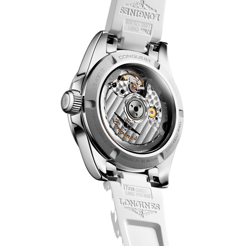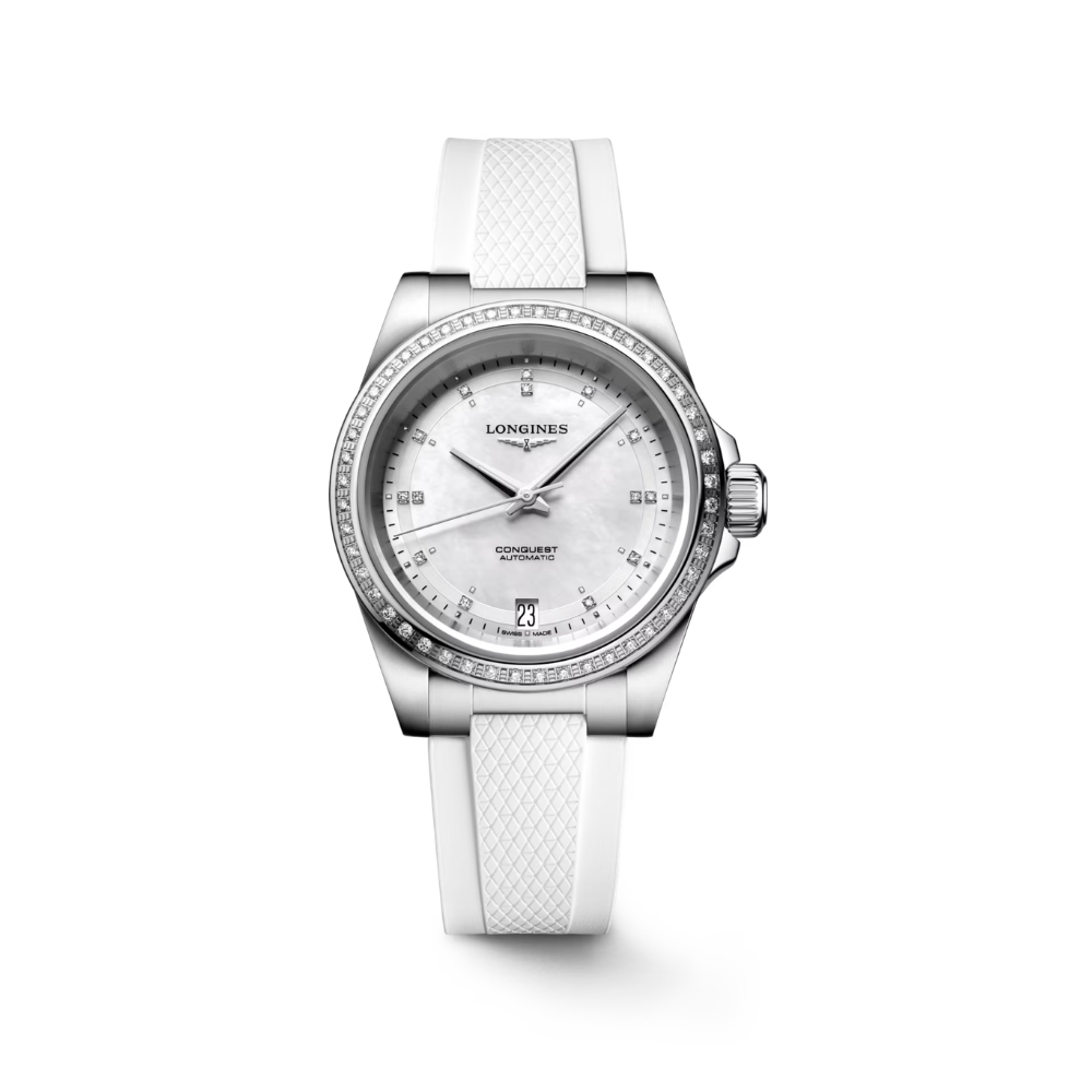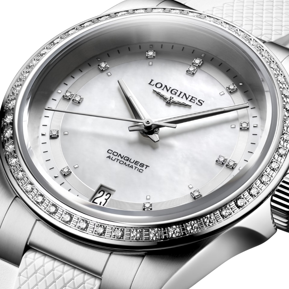 Made in stainless steel this timepiece features a 34mm case, offering contemporary proportions while maintaining the robust character associated with the Conquest line. The watch features a luminous mother-of-pearl dial, enhanced by diamond hour markers that introduce refined brilliance without compromising legibility. A date display at 6 o’clock ensures symmetry and everyday functionality. Framing the case, a diamond-set bezel adds further distinction, elevating this model beyond a traditional sports watch into a versatile luxury timepiece. Powered by the Longines automatic calibre L888, this self-winding movement delivers dependable performance and an extended power reserve. Finished with a stainless steel bracelet and sapphire crystal, the watch combines durability with refined aesthetics.