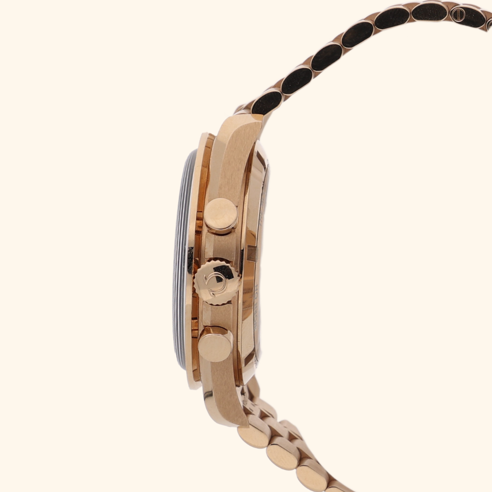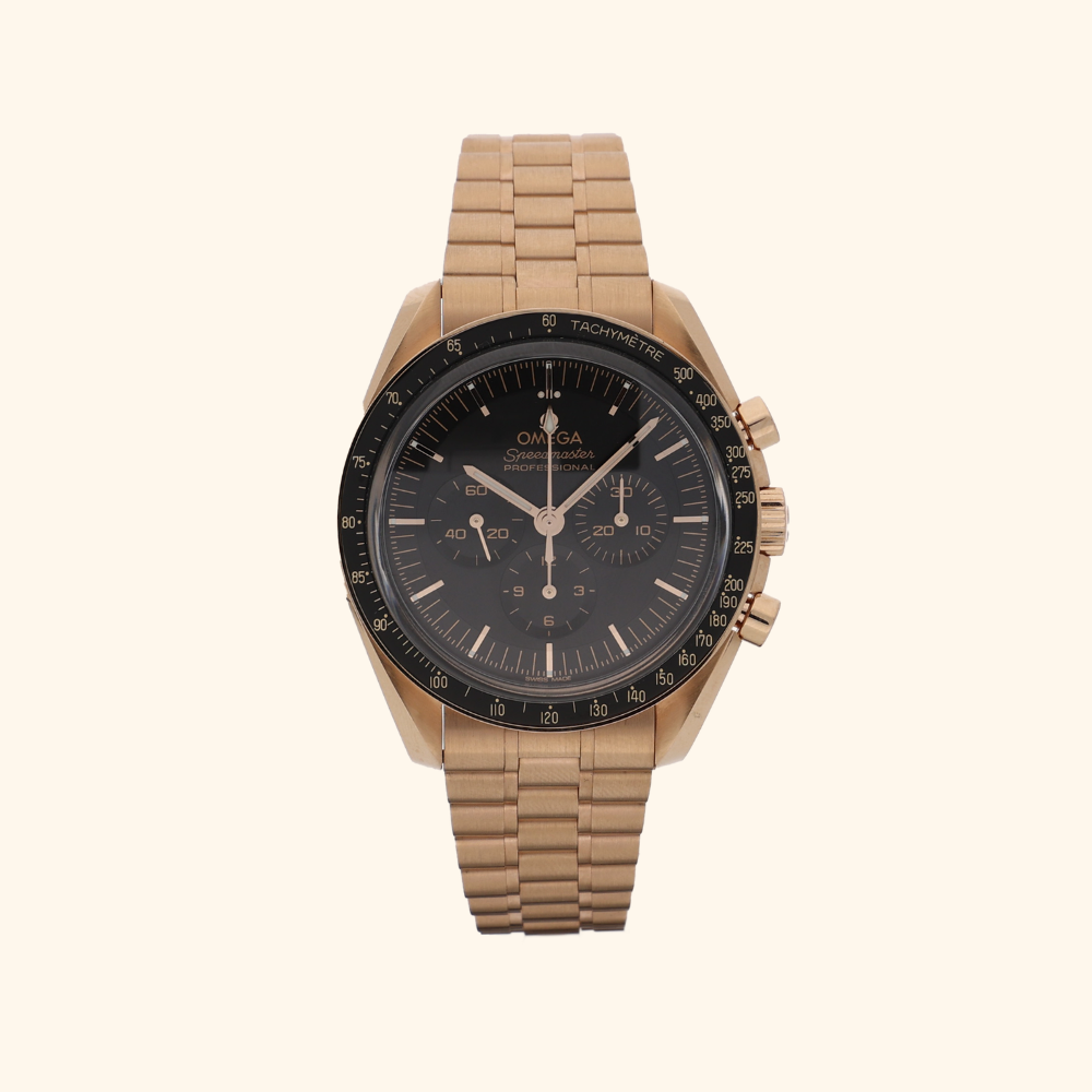 This Pre-Owned OMEGA timpiece is made entirely in 18ct Sedna gold, giving the legendary Moonwatch a luxurious interpretation. The 42mm case frames a striking black dial featuring the classic tri-compax chronograph layout, with three sub-dials, a tachymeter scale on the bezel, and luminous hands and markers for excellent legibility. The watch is powered by the OMEGA Co-Axial Master Chronometer Calibre 3861, a hand-wound movement certified by METAS, ensuring exceptional precision, magnetic resistance, and reliability. The movement can be admired through the sapphire crystal case back, while sapphire crystal also protects the dial.