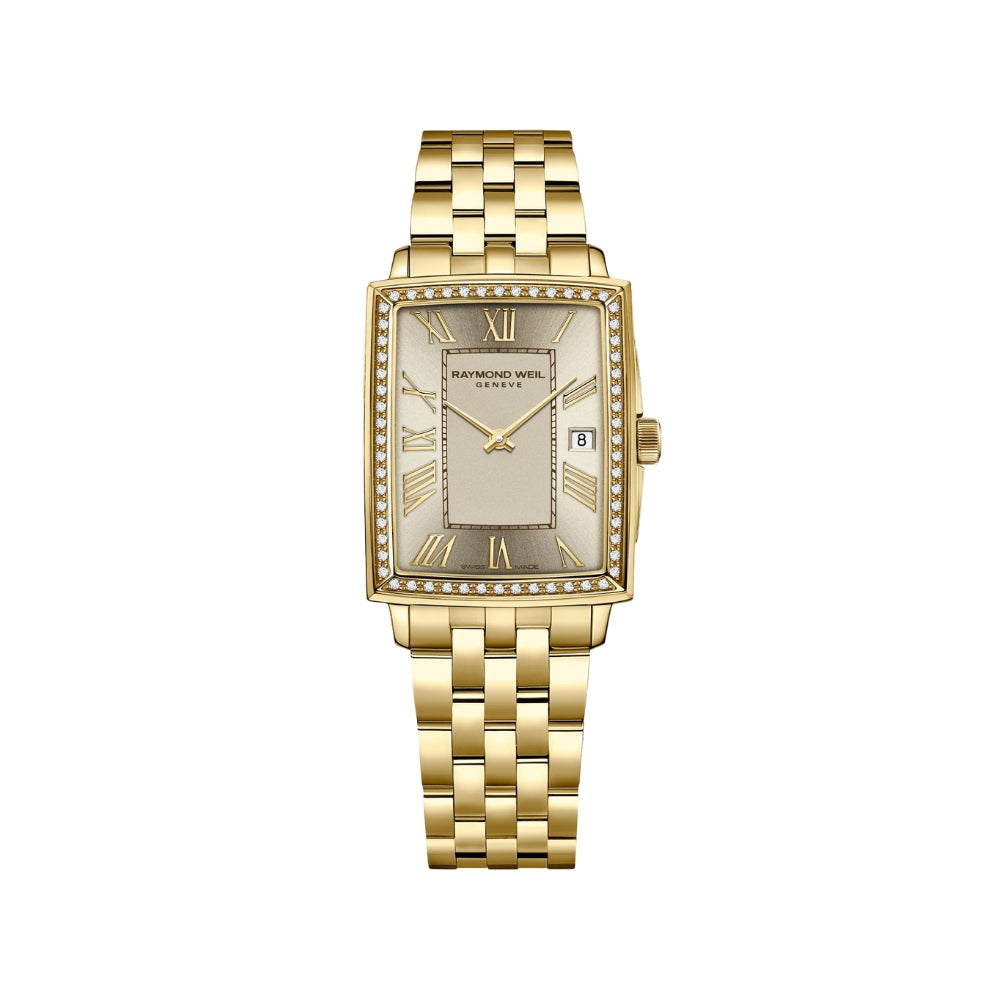 The Raymond Weil Toccata features a 34mm yellow gold PVD coated stainless steel rectangular case paired with a matching bracelet, creating a sleek and elegant silhouette. Its champagne dial is framed by a diamond set bezel, adding a refined touch of sparkle. Powered by a reliable quartz movement and offering 50 meters of water resistance, this watch is a versatile choice for both everyday wear and special occasions.