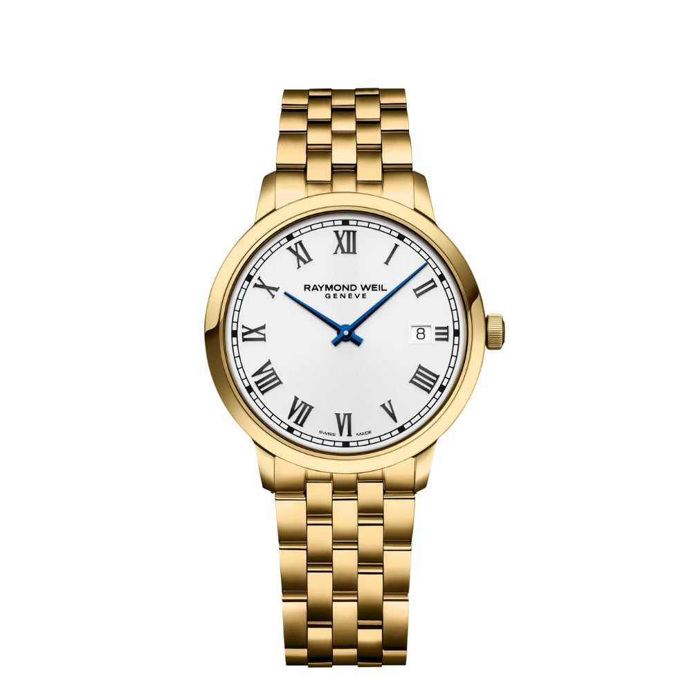 The Raymond Weil Toccata Classic 39mm White Dial Watch features a stainless-steel case and bracelet coated in yellow gold PVD, offering a refined and timeless appearance. Its crisp white dial is accented with elegant blue hands, creating a clean and sophisticated contrast. Powered by a reliable quartz movement and finished with 50 meters resistance, this watch is a versatile choice for both everyday wear and formal occasions.