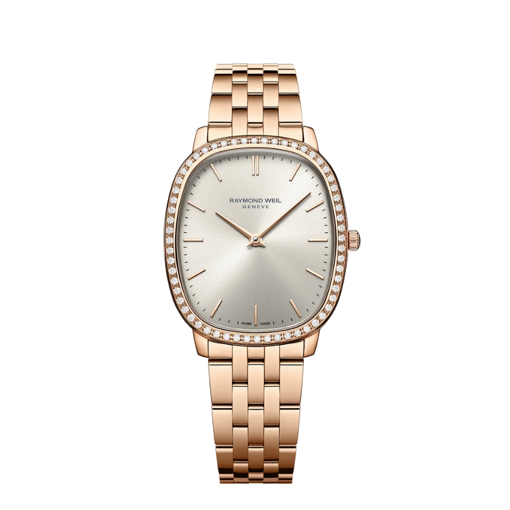 The Raymond Weil Toccata Heritage features a 31mm rose gold PVD coated stainless steel oval case and matching bracelet, creating a graceful and refined silhouette. Its silver dial is beautifully framed by a diamond set bezel, adding a subtle touch of sparkle. Powered by a reliable quartz movement and with 30 meters of water resistance, this watch is an elegant choice for both everyday wear and special occasions.