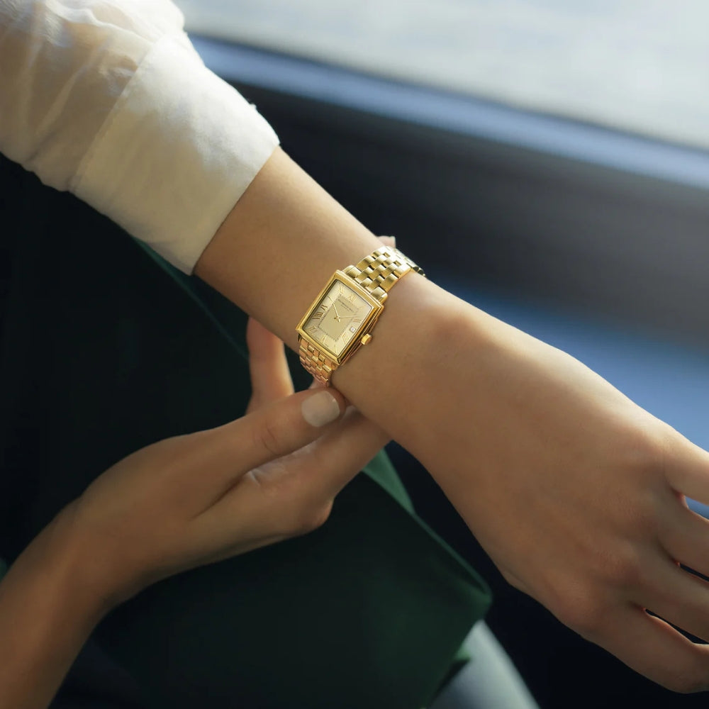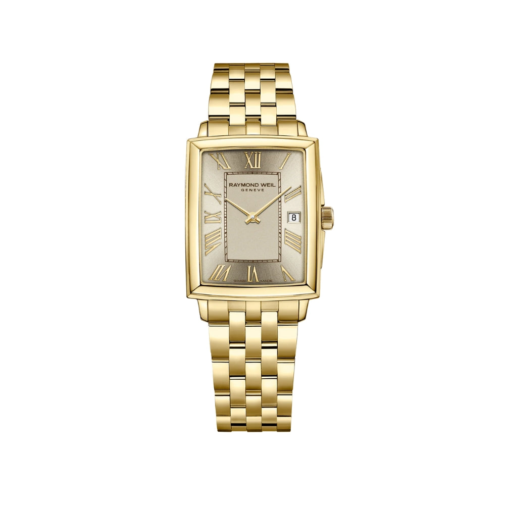 The Raymond Weil Toccata Ladies Champagne Watch features a 22mm rectangular case and bracelet crafted from yellow gold PVD stainless steel, offering a sleek and elegant silhouette. Its champagne dial adds a warm, understated glow, while the quartz movement ensures reliable and accurate timekeeping. With 50 meters water resistance, this timepiece is a polished and versatile accessory suited for both everyday wear and special occasions.