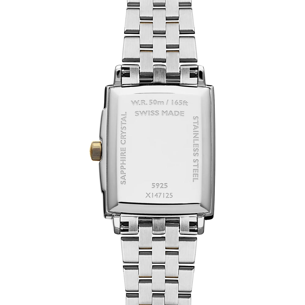 The Raymond Weil Toccata features a 22mm stainless steel and yellow gold PVD rectangular case and bracelet, creating a balanced and elegant two-tone look. Its crisp white dial keeps the design clean and timeless, while the quartz movement delivers reliable, everyday accuracy. With 50 meters of water resistance, this watch is a refined yet practical choice.