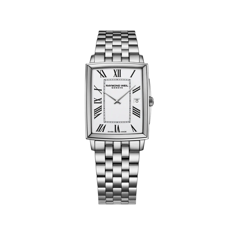 The Raymond Weil Toccata Square features a distinctive 37mm rectangular stainless-steel case paired with a matching bracelet, offering a refined and contemporary silhouette. Its clean white dial enhances the watch’s minimalist elegance, while the precise quartz movement ensures reliable timekeeping. With 50 meters of water resistance, this timepiece blends craftmanship with practicality.