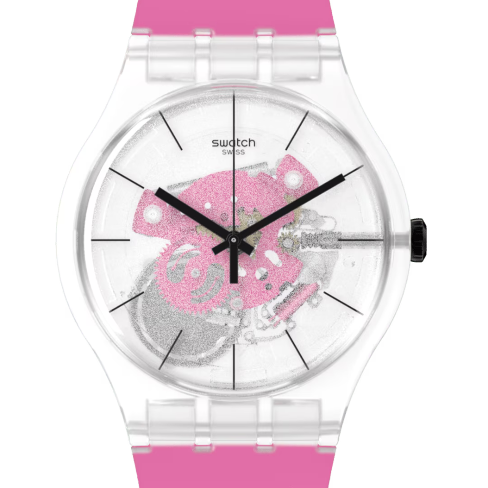 The Swatch Pink Daze watch is a 41mm timepiece that brings a fresh, vibrant pop of colour to the wrist. It features a transparent matte bio-sourced case paired with a matte silicone strap detailed with a pink print. The clear case, enhanced with semi-transparent white and black print reveals the hidden pink quartz movement beneath. This piece is stunning in pink, and its semi-transparent case creates a layered and visually dynamic design.