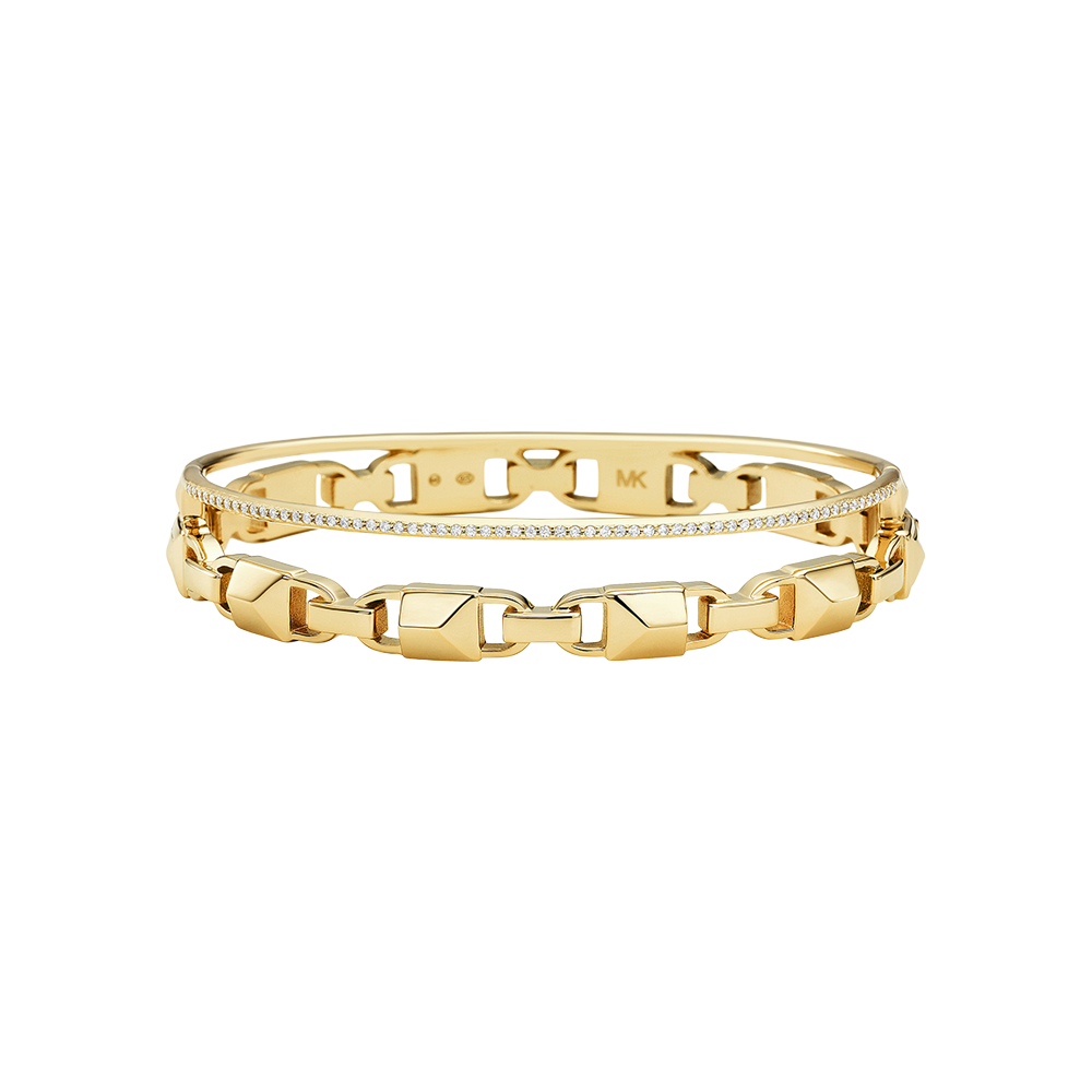 This Michael Kors gold-plated bangle features a layered look with a chunky link chain bracelet paired with a slim tennis-style bracelet. Its two-in-one design creates a chic, stacked effect.