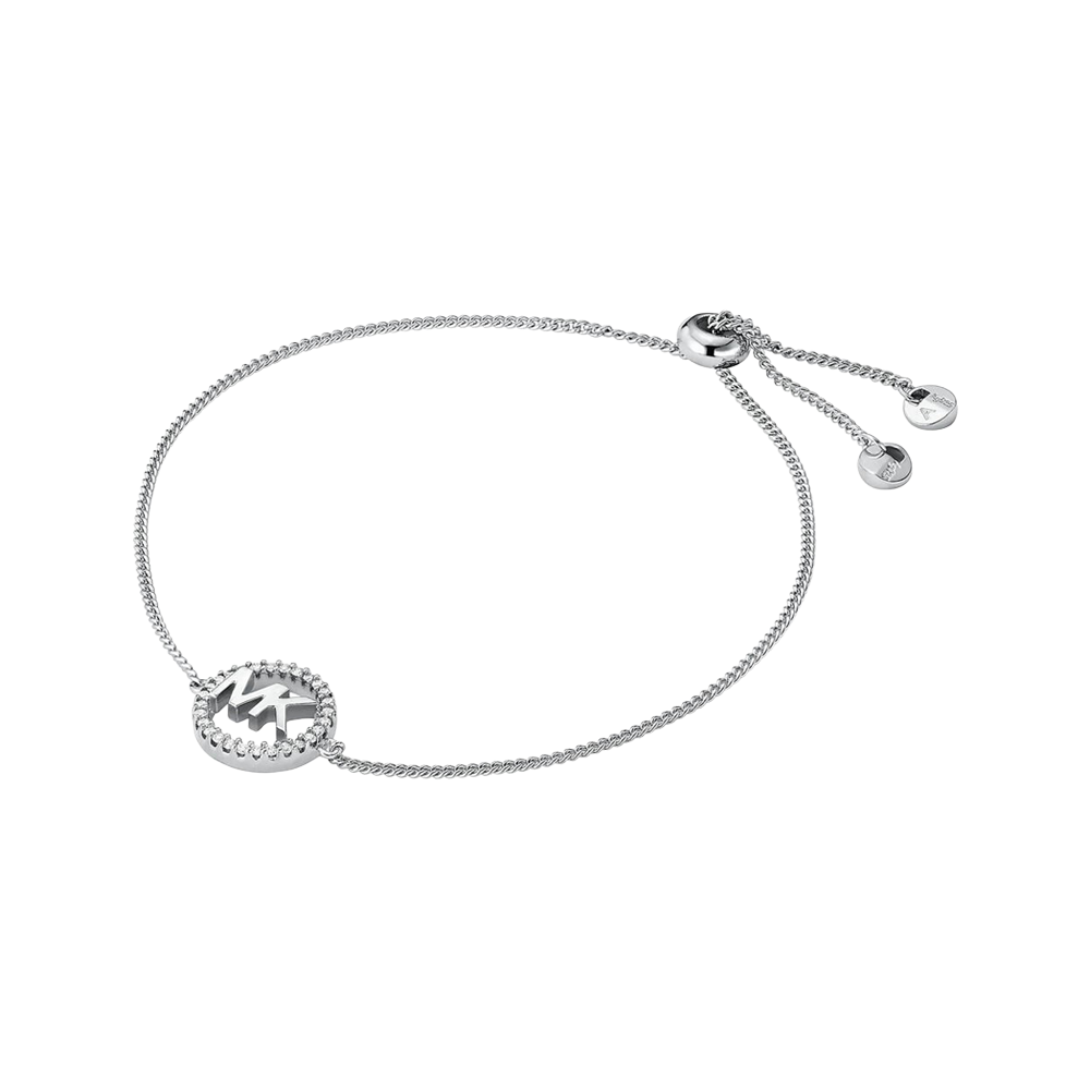 Michael Kors Sterling Silver CZ Circle MK Adjustable Bracelet features a sparkling CZ circle with a solid MK logo on a polished sterling silver band with toggle closure.