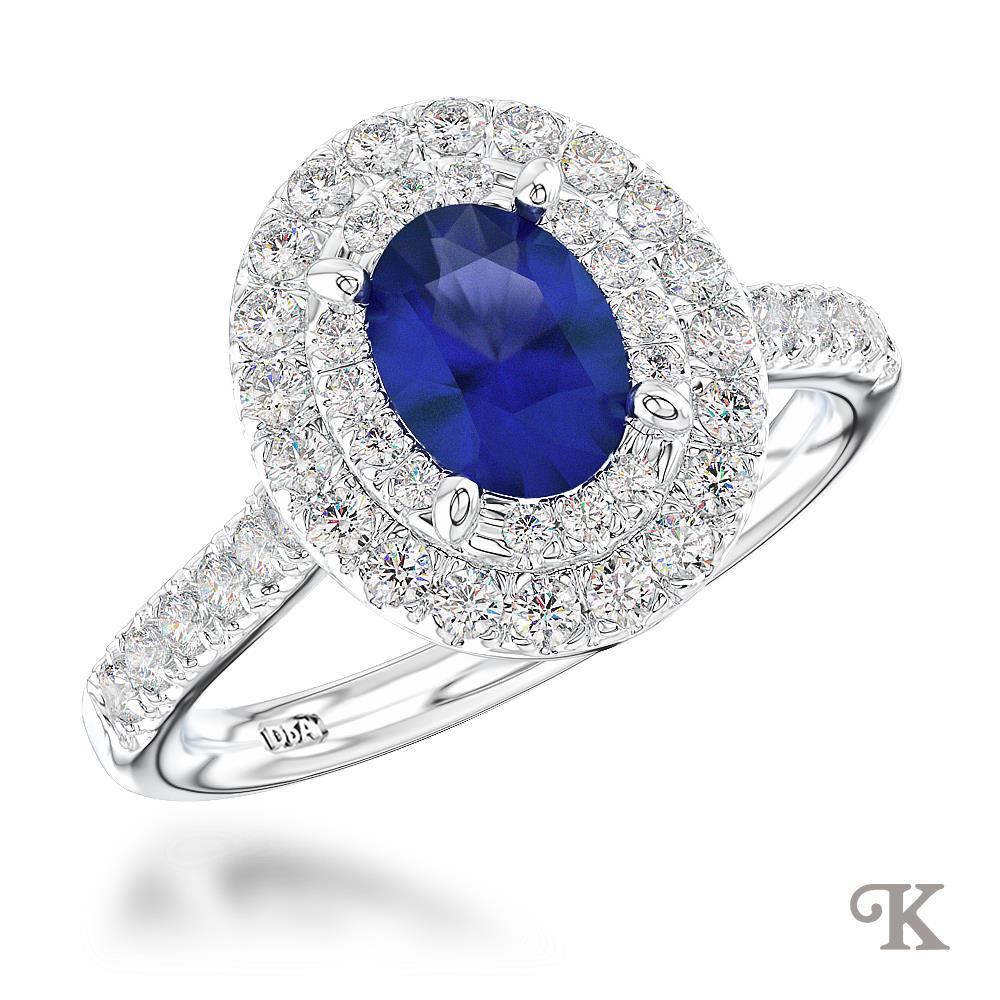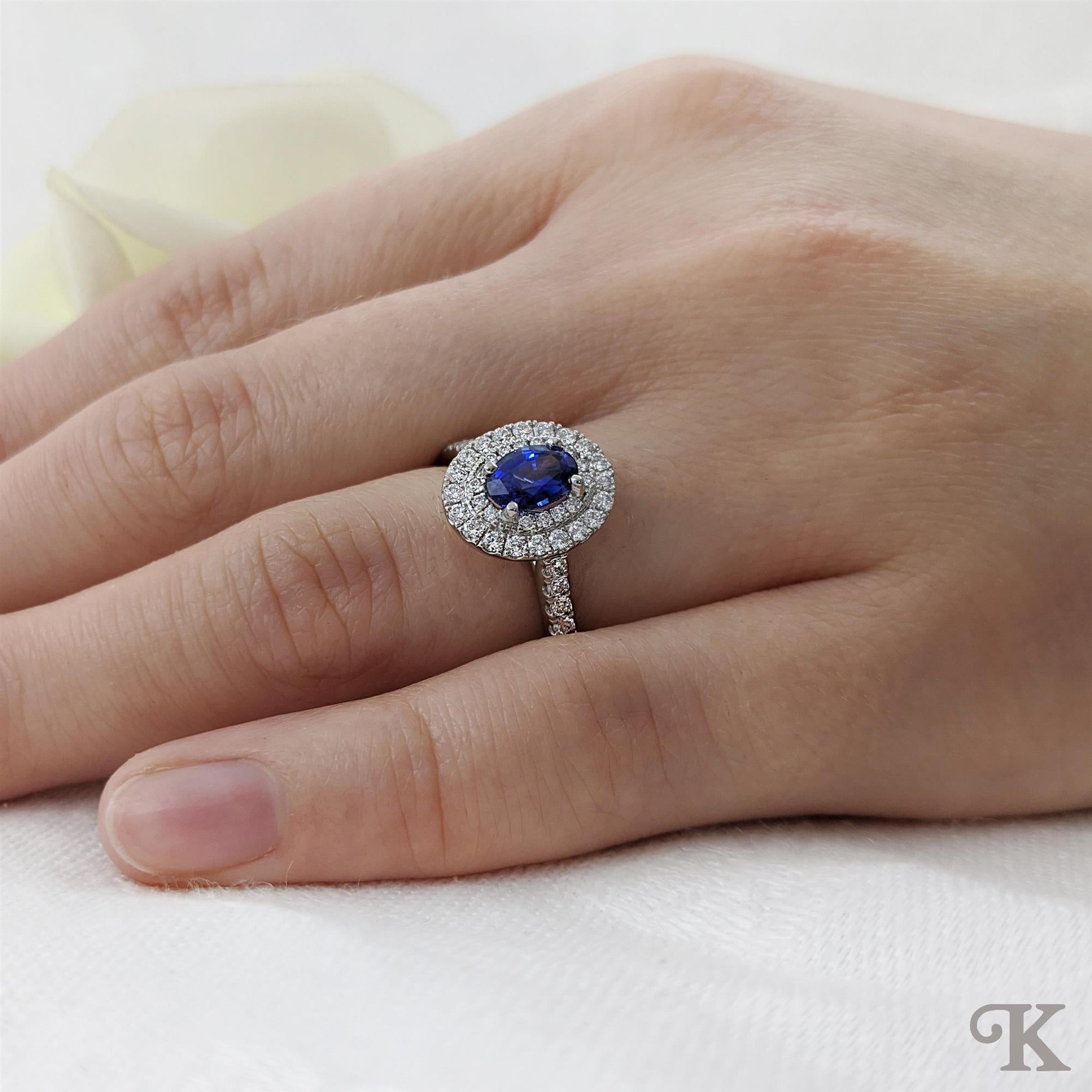 Platinum Halo Cluster Oval cut Sapphire engagement ring in a Platinum Claw Set on a Platinum Diamond Band 1.02ct total