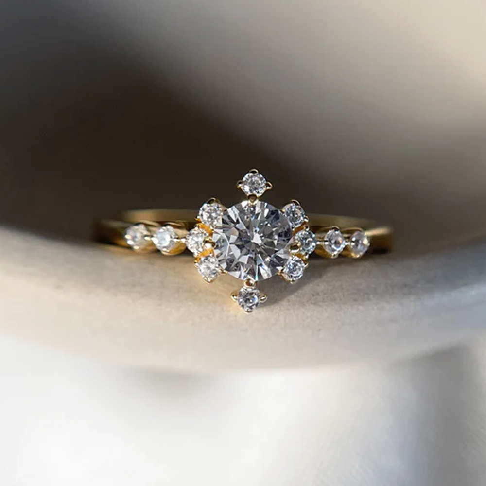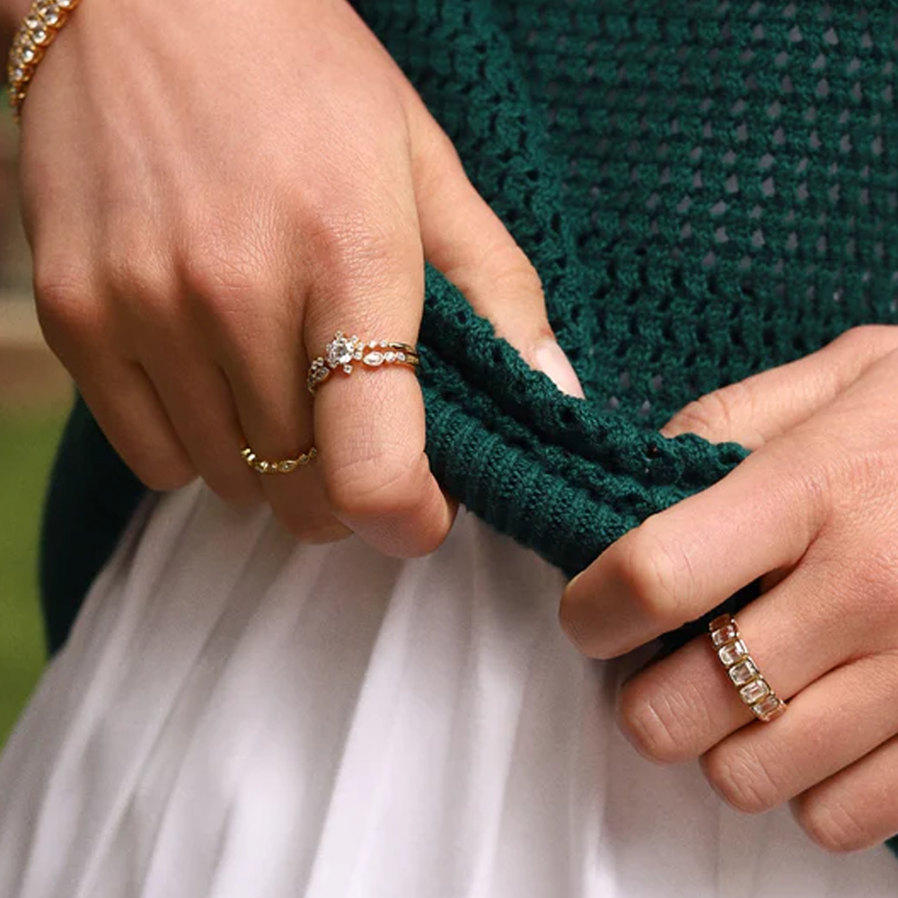 Radiant and romantic, the Junie Ring captures light from every angle. Made in sterling silver with yellow gold vermeil, it features a dazzling round centre stone framed by a constellation of smaller stones that dance along the band. Delicate yet eye-catching, this beautifully balanced design brings a touch of modern brilliance to any occasion.