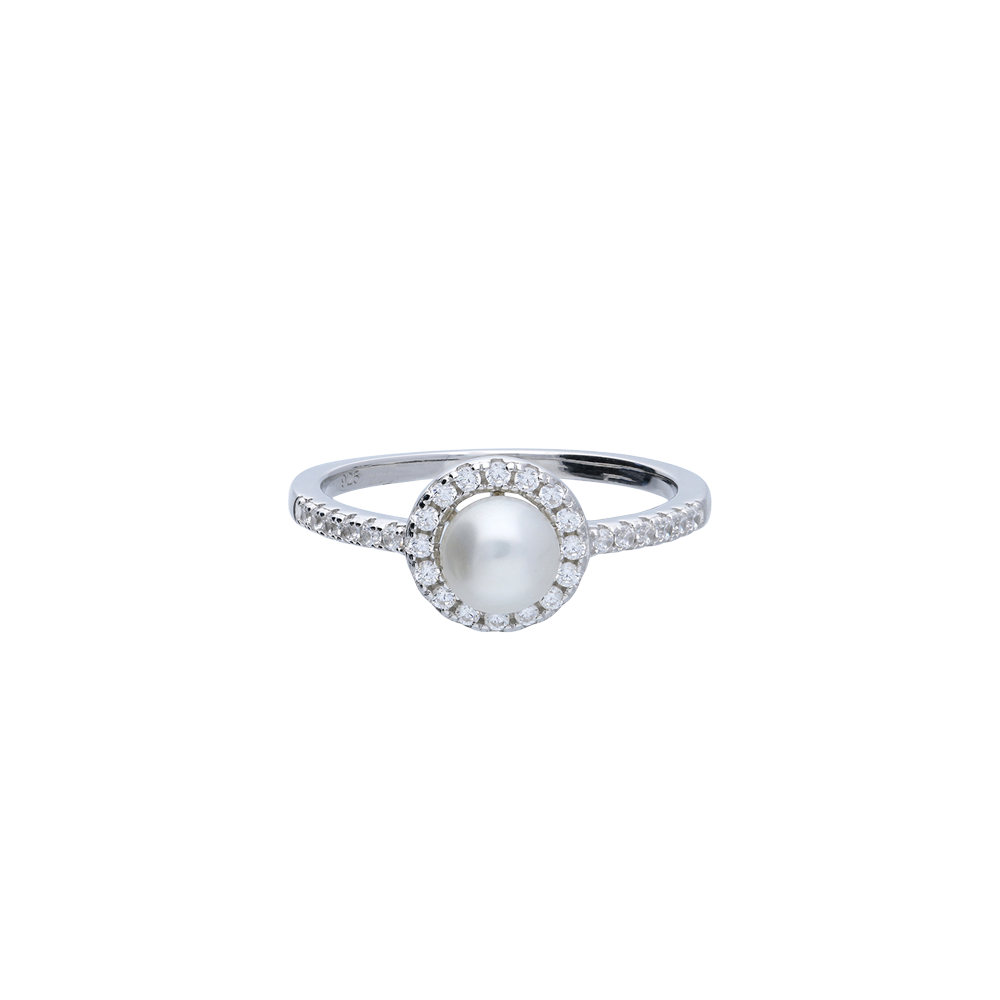 This sterling silver dress ring features a pearl in the centre with a halo of cubic zirconia stones around it, giving it extra sparkle.