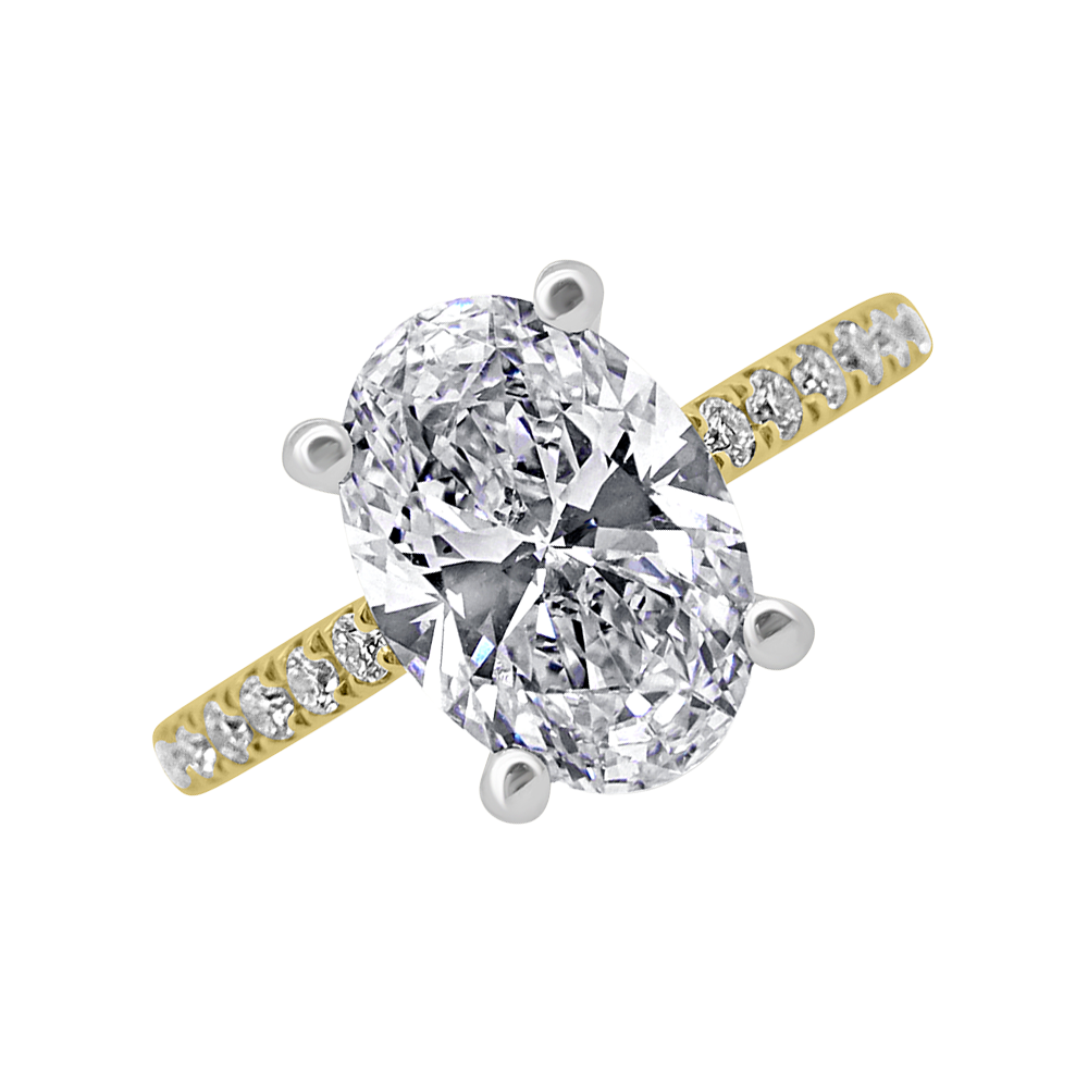 Graded E for colour and S|2 for clarity, the centre stone is HRD certified, providing assurance of quality and provenance. The slim yellow gold band is enhanced with pave-set natural diamonds along the shoulders, totalling .22ct, adding subtle brilliance without detracting from the centre stone's presence. The combination of a classic oval silhouette and pave detailing creates a timeless design.