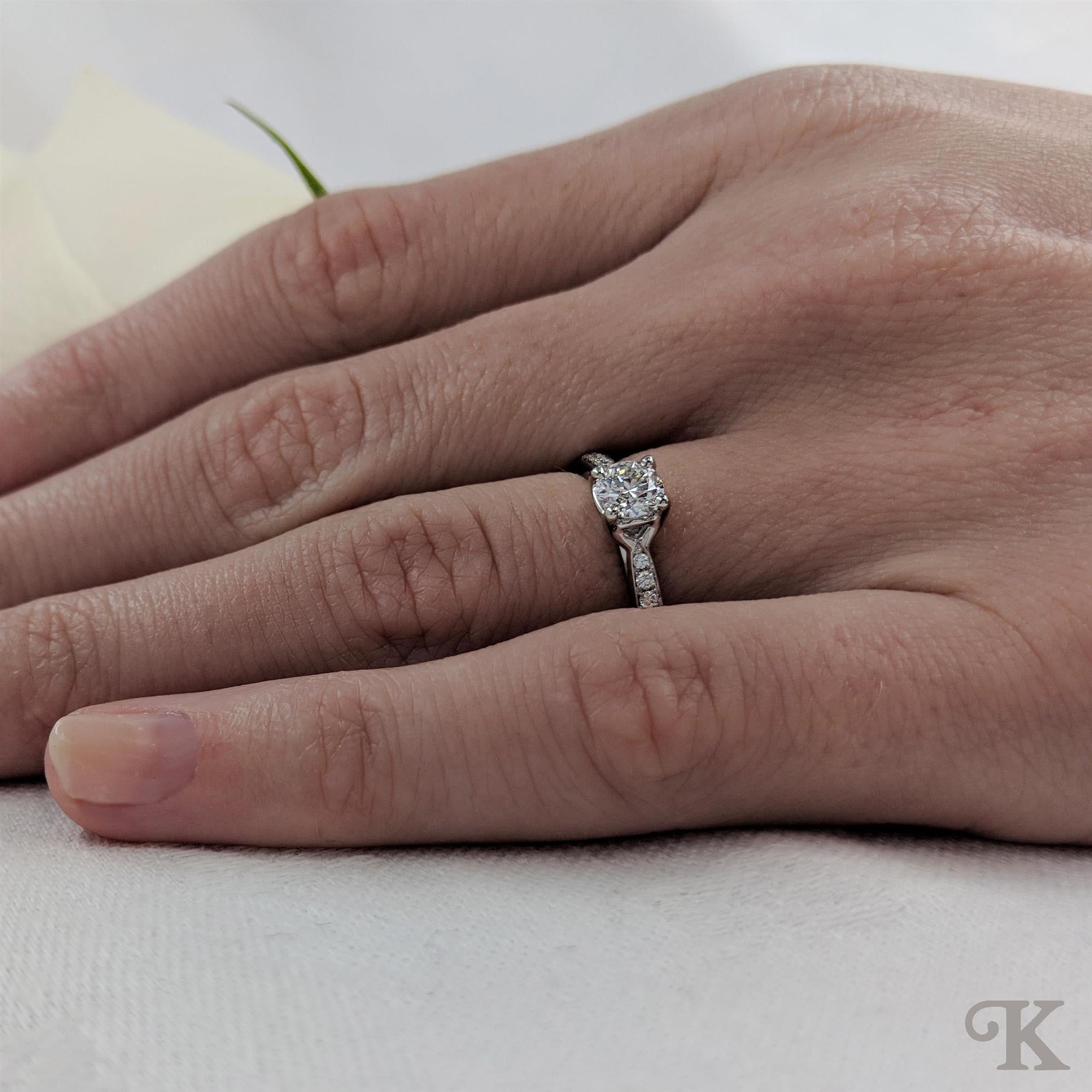 Solitaire brilliant cut diamond engagement ring in a four claw setting with micro-set diamond shoulders in all platinum.