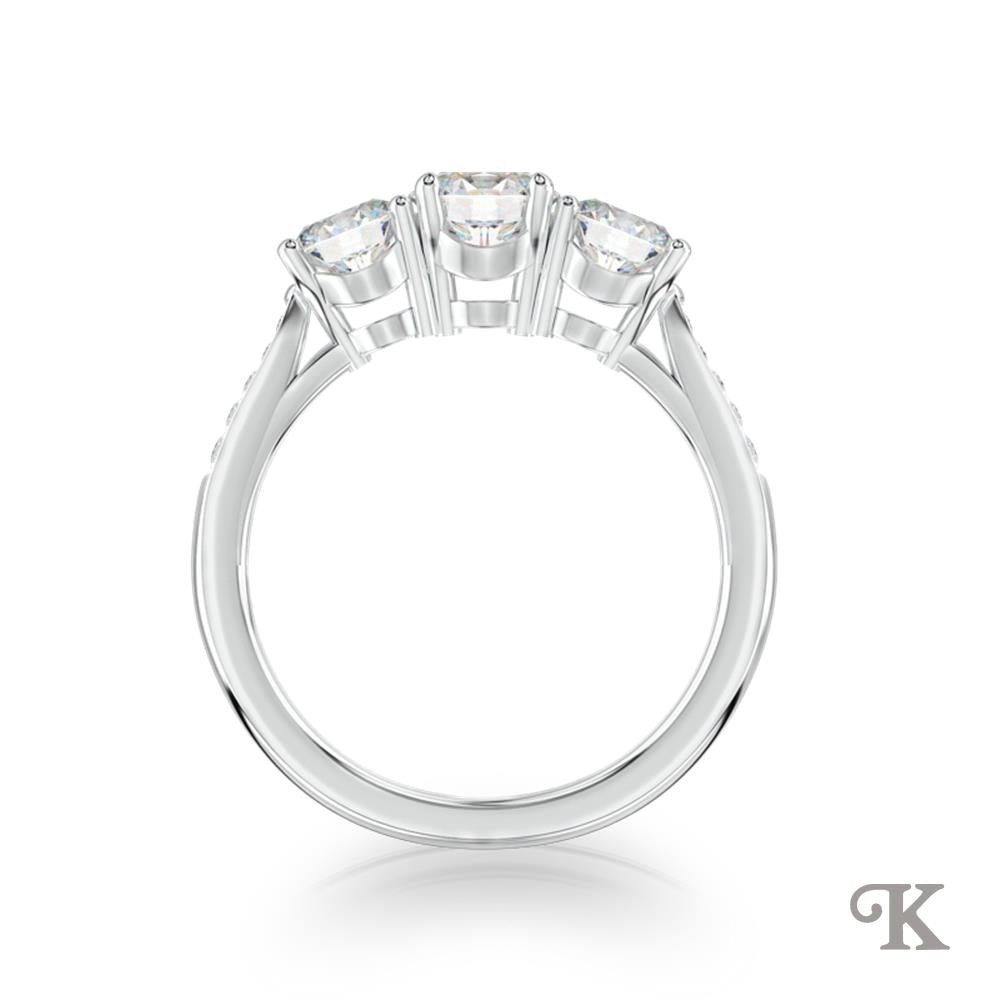 Platinum Three Stone Micro-set diamond shoulders combined with three matching stones perfectly blend the grandeur and brilliance of diamonds to create a wonderfully unique ring. 2.12ct total G Colour