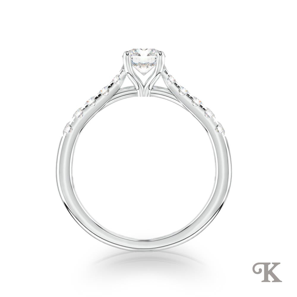 Platinum Solitaire Round cut Diamond engagement ring with scalloped set diamond shoulders. In a Platinum Claw Set 1.24ct total D Colour