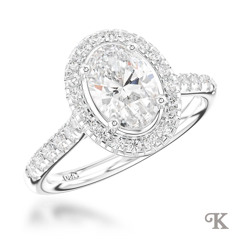 Platinum Halo A Oval cut Diamond and Diamond Cluster surrounded by smaller round brilliant cut diamonds on a Platinum Diamond Band. In a classic scalloped Skye Oval setting 1.40ct total E Colour