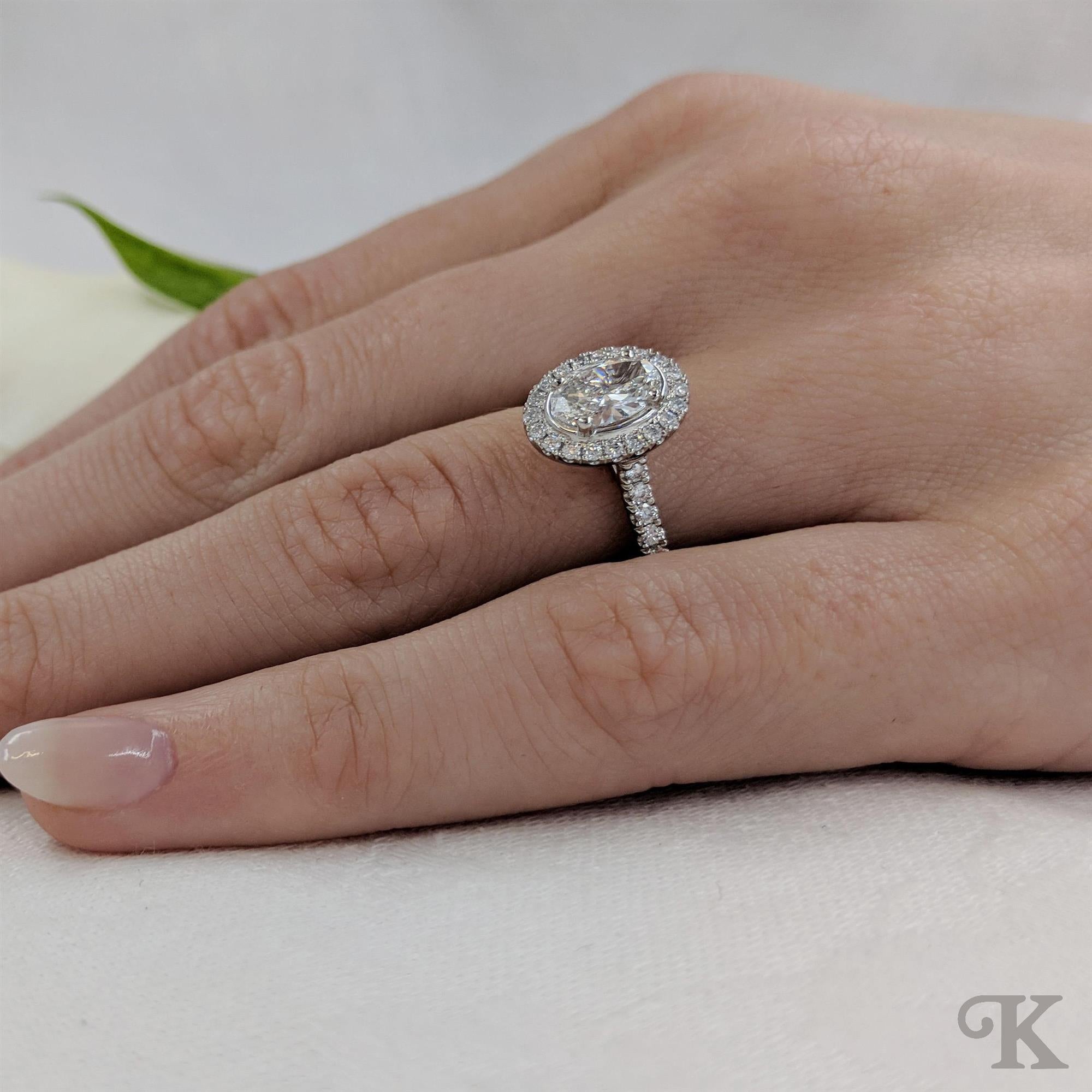 Platinum Halo A Oval cut Diamond and Diamond Cluster surrounded by smaller round brilliant cut diamonds on a Platinum Diamond Band. In a classic scalloped Skye Oval setting 0.99ct total F Colour