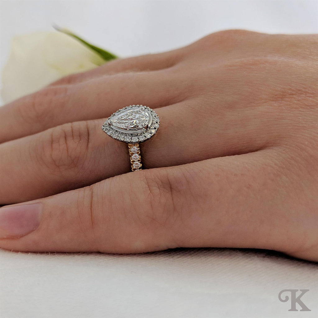 18ct Yellow Gold Shank and Platinum Head Halo A Pear cut Diamond and Diamond Cluster surrounded by smaller round brilliant cut diamonds on a 18ct Yellow Gold Diamond Band. In a classic scalloped Skye setting 0.73ct total D Colour