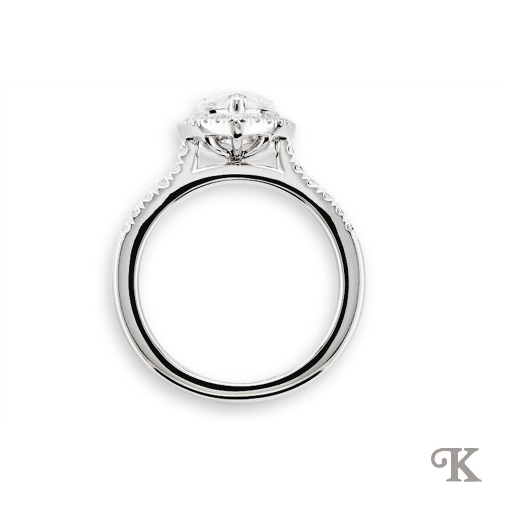 Platinum Halo A Pear cut Diamond and Diamond Cluster surrounded by smaller round brilliant cut diamonds on a Platinum Diamond Band. In a classic scalloped Skye Pear setting 1.10ct total F Colour