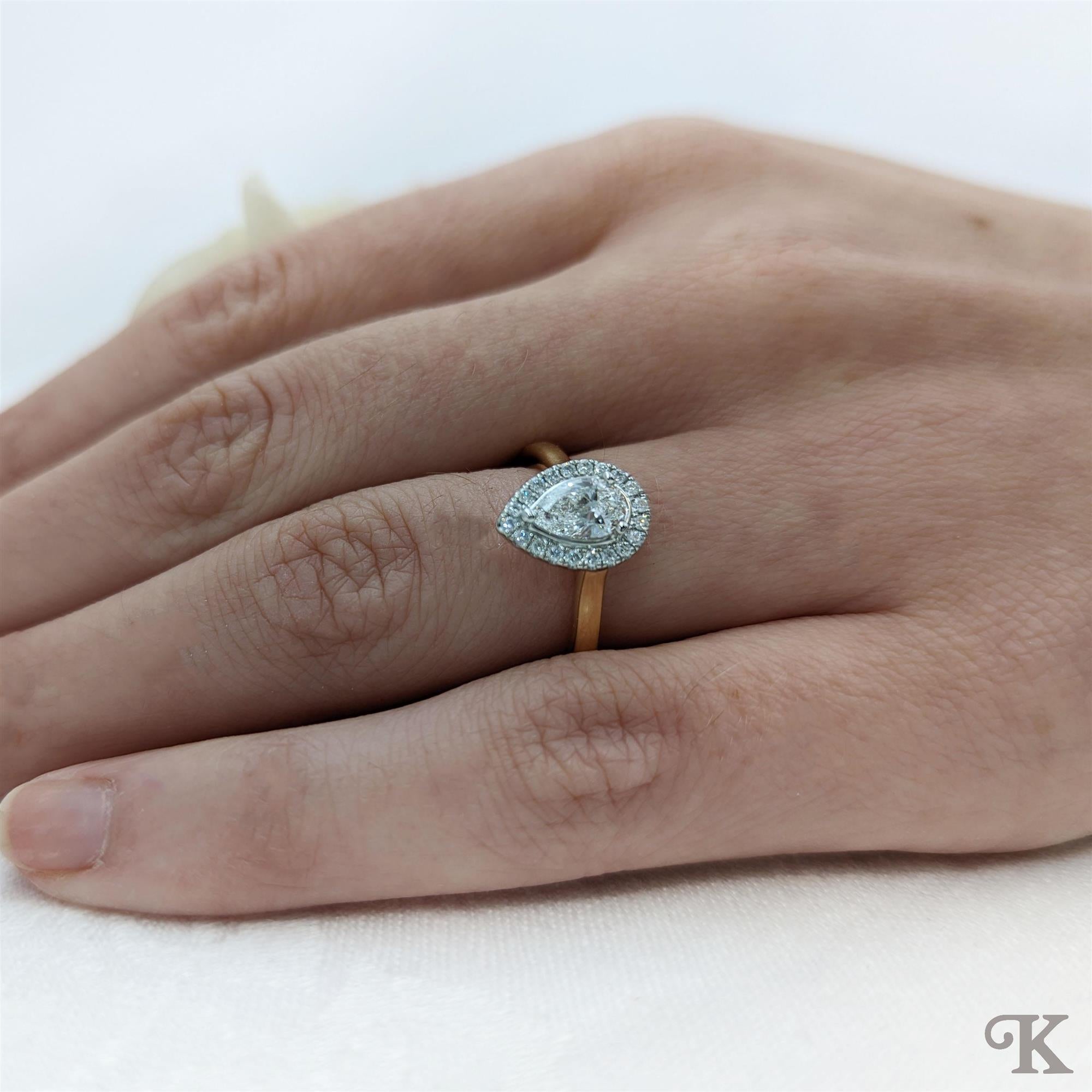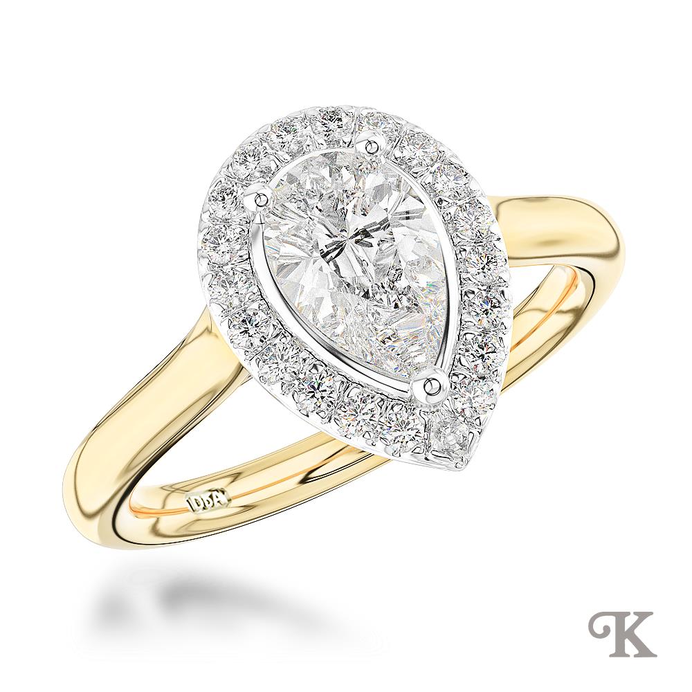 18ct Yellow Gold Shank and Platinum Head Halo A Pear cut Diamond and Diamond Cluster surrounded by smaller round brilliant cut diamonds on a 18ct Yellow Gold Plain Band. In a classic scalloped Skye setting 0.87ct total D Colour