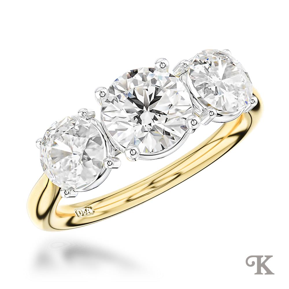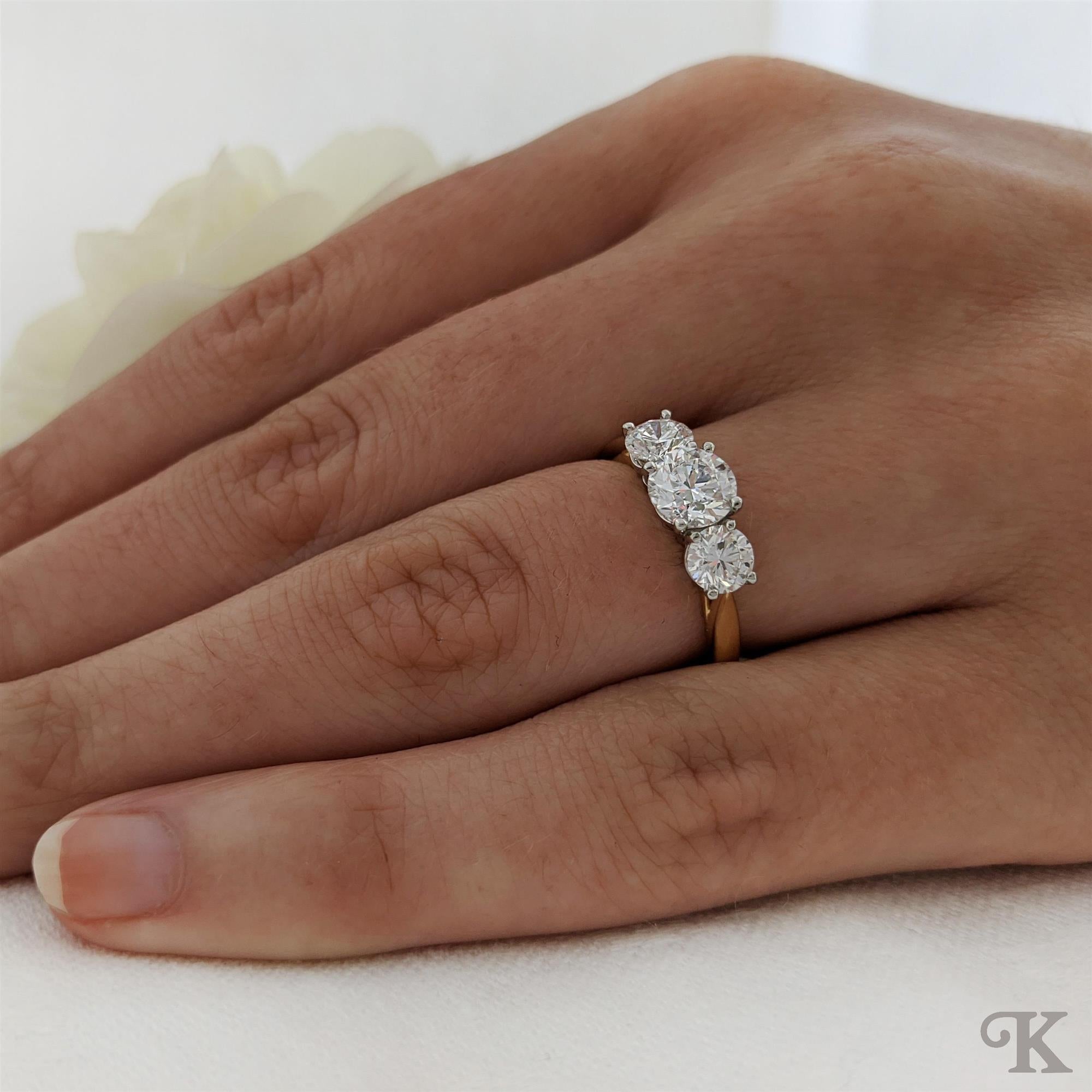18ct Yellow Gold Shank and Platinum Head Three Stone Three round brilliant diamonds with curved galleries. Set in Platinum on an 18ct yellow gold band. Perfectly wed set. 1.70ct total F Colour
