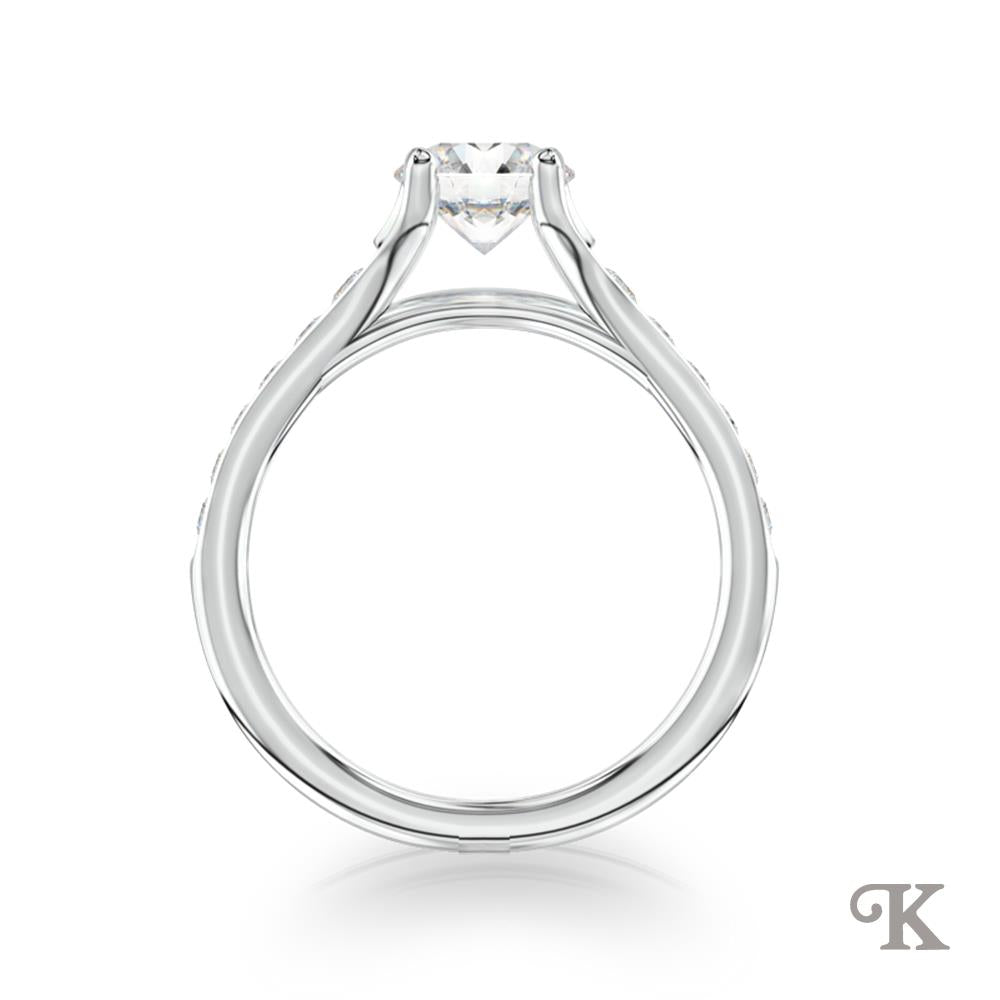 A classical solitaire with hand crafted graduated micro-set diamond shoulders with delicate split. Elegant and refined.