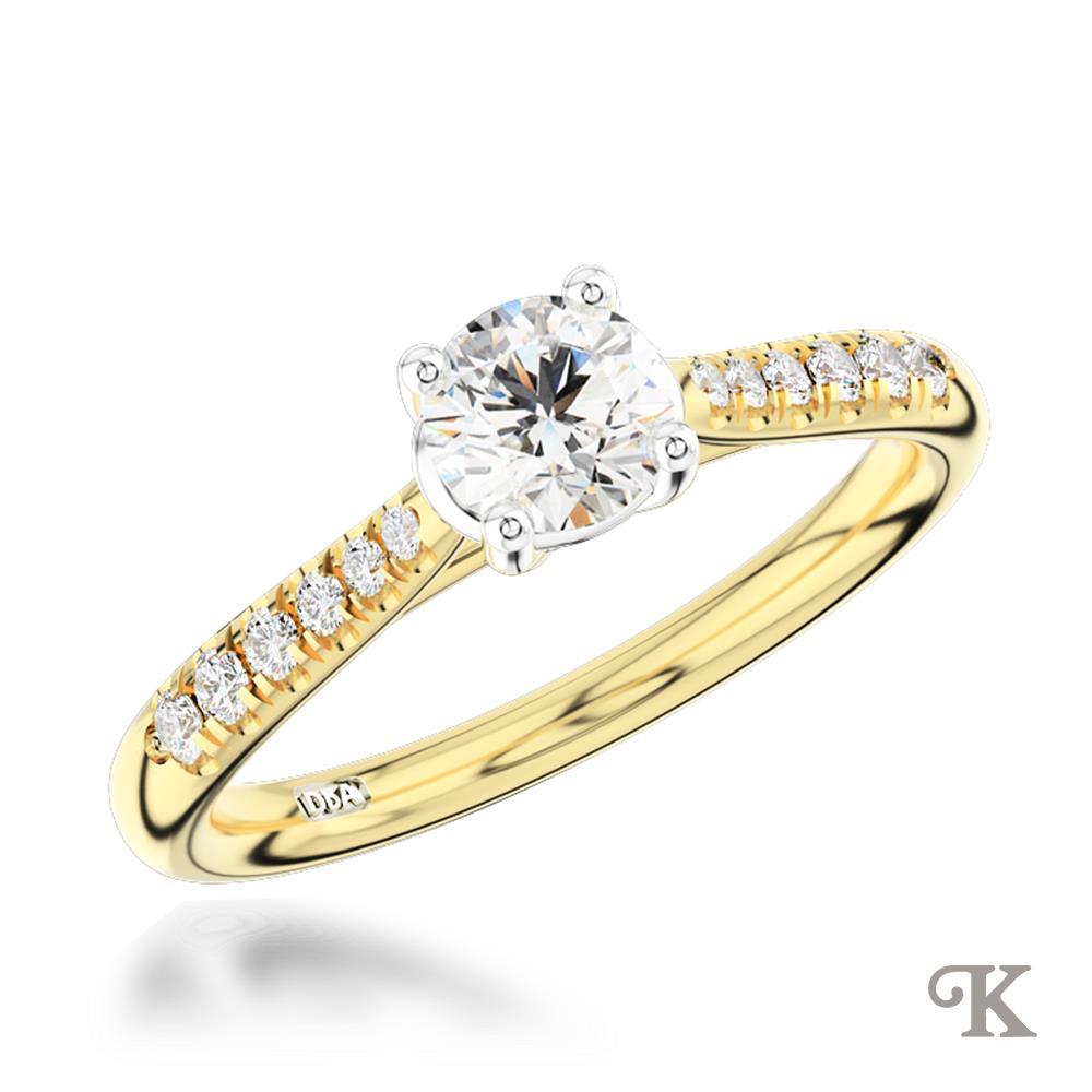 18ct Yellow Gold Shank and Platinum Head Solitaire Round Brilliant cut diamond engagement ring with scalloped set diamond shoulders. In a 4 claw setting 0.61ct total G Colour