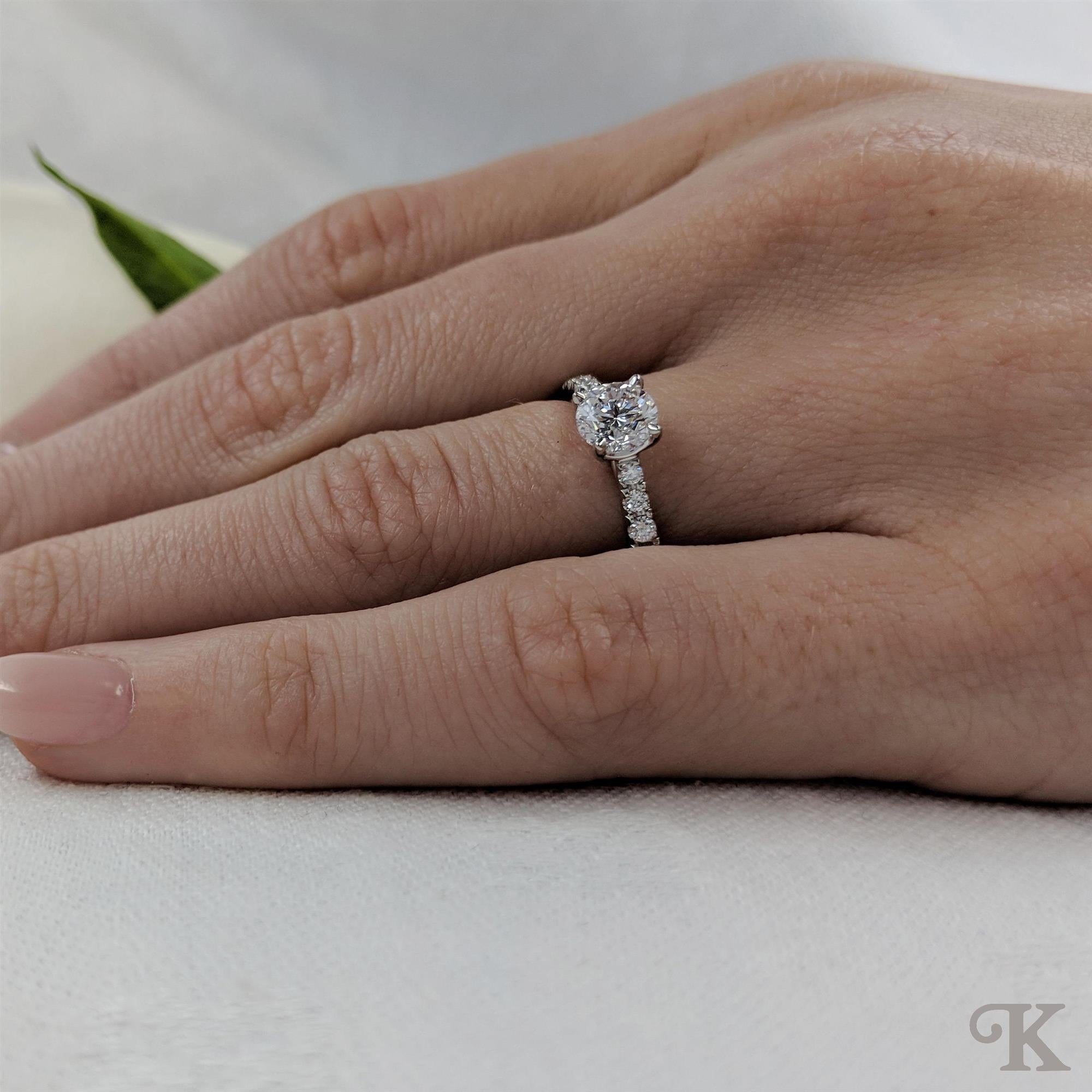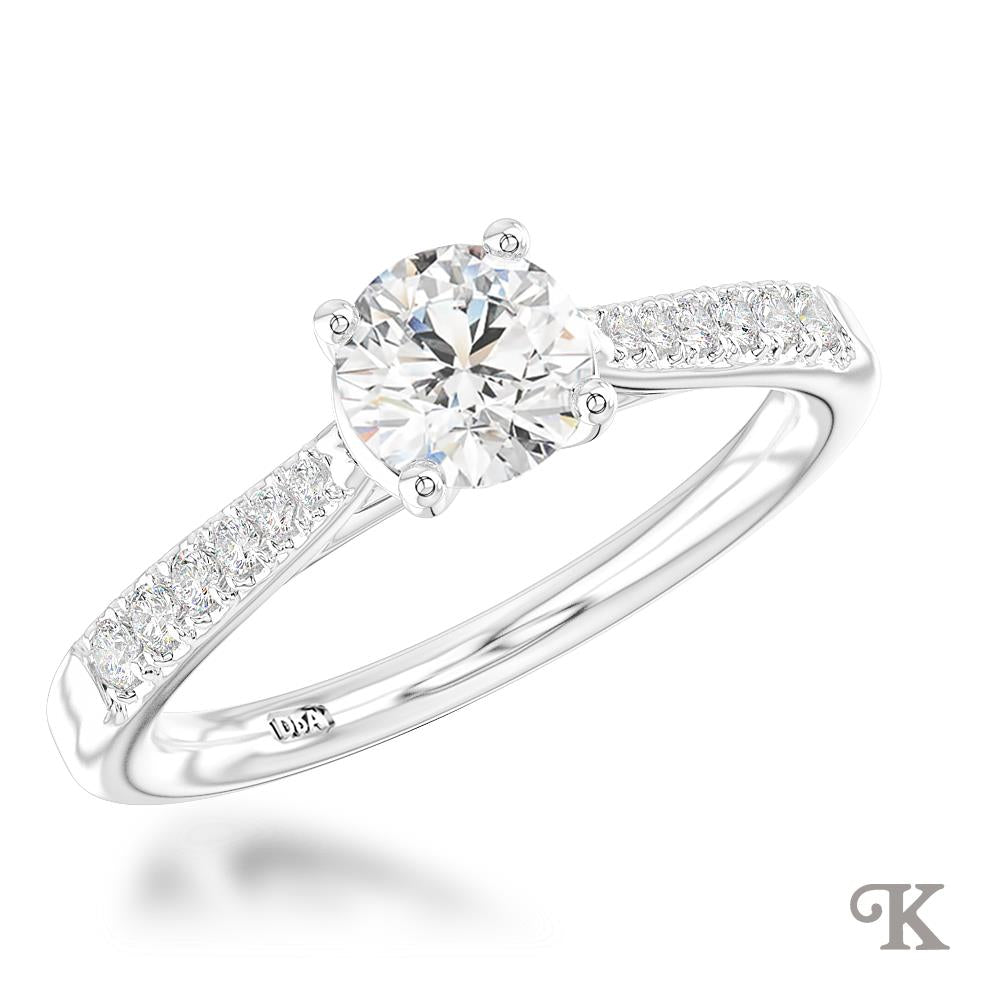 Platinum Solitaire Round cut Diamond engagement ring with scalloped set diamond shoulders. In a Platinum Claw Set 0.79ct total F Colour