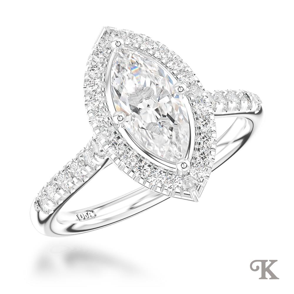 Platinum Halo A Marquise cut Diamond and Diamond Cluster surrounded by smaller round brilliant cut diamonds on a Platinum Diamond Band. In a classic scalloped Skye Marquise setting 1.09ct total D Colour
