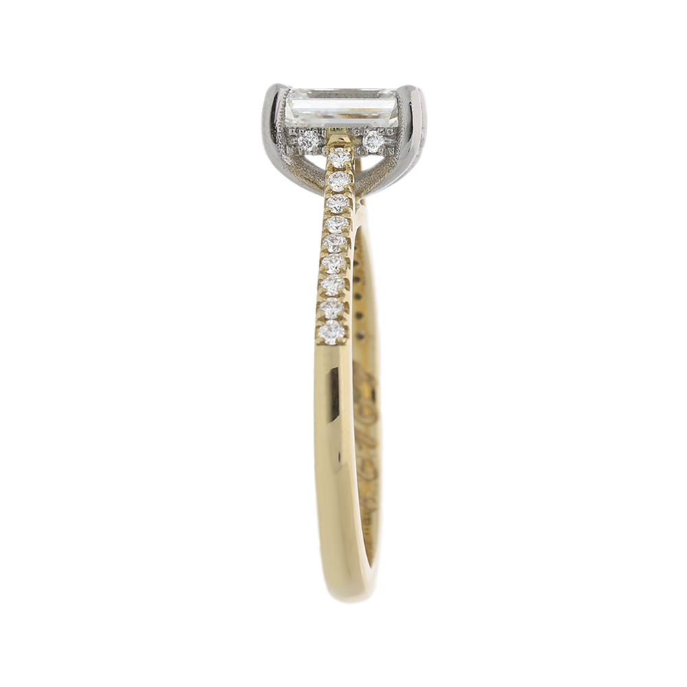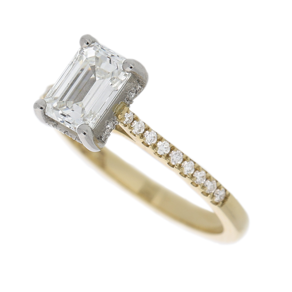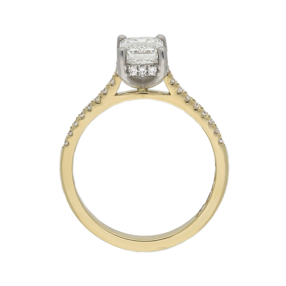 This elegant ring features a 1.20ct emerald-cut natural diamond, graded G colour and VVS2 clarity, and accompanied by a GIA certificate. A delicate hidden halo of diamonds sits just beneath the centre stone, visible only from the side for a subtle touch of brilliance. The front of the 18ct yellow gold band is pave-set with diamonds, adding refined sparkle.