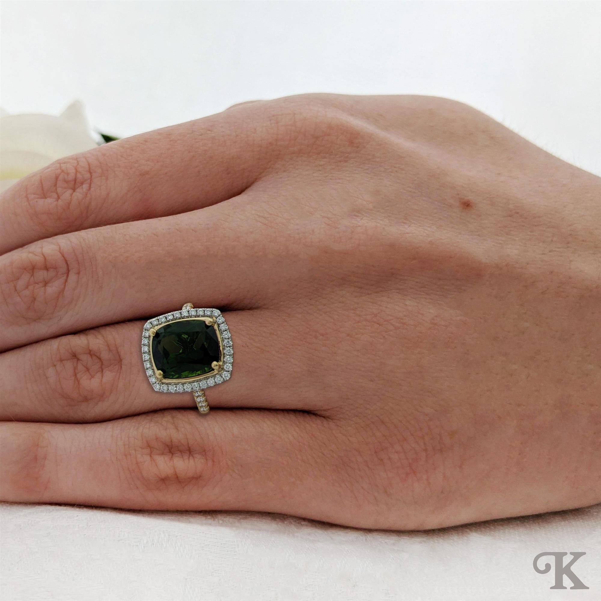 18ct Yellow Gold Shank and Platinum Head Halo A Cushion cut Chrome Tourmaline and Diamond Cluster surrounded by smaller round brilliant cut diamonds on a 18ct Yellow Gold Diamond Band. In a classic scalloped Skye Oval setting 5.30ct total