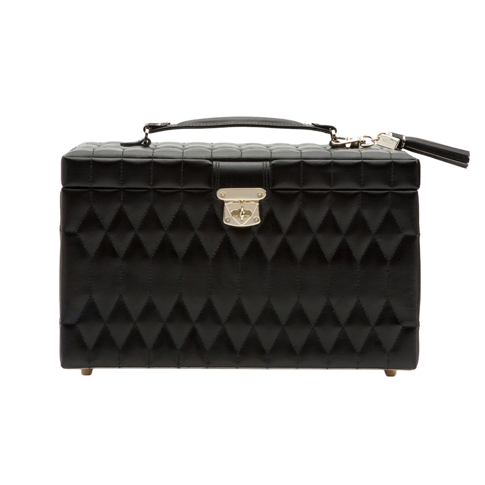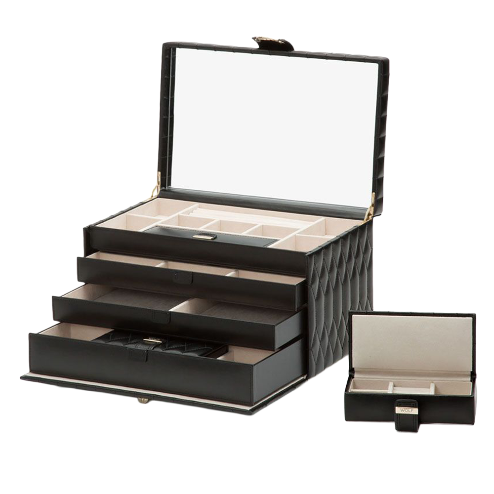 The WOLF Caroline Large Jewellery Case in black is a timeless classic, inspired by the elegant soft lines of the 1950s. Made from supple, diamond-quilted black leather and finished with gleaming gold-tone hardware, this refined case offers a sophisticated home for your most precious jewellery and heirlooms. Lined with WOLF's patented LusterLoc technology, this fabric absorbs gases that cause tarnishing - helping to prevent it for up to 35 years under typical storage conditions.