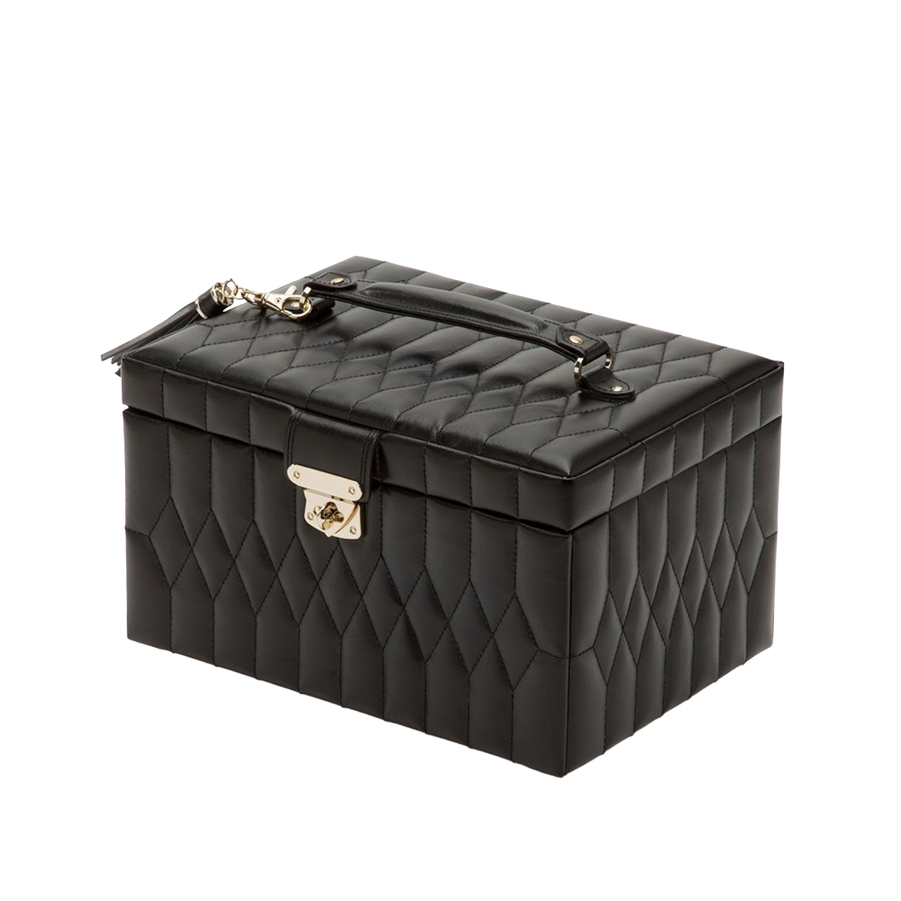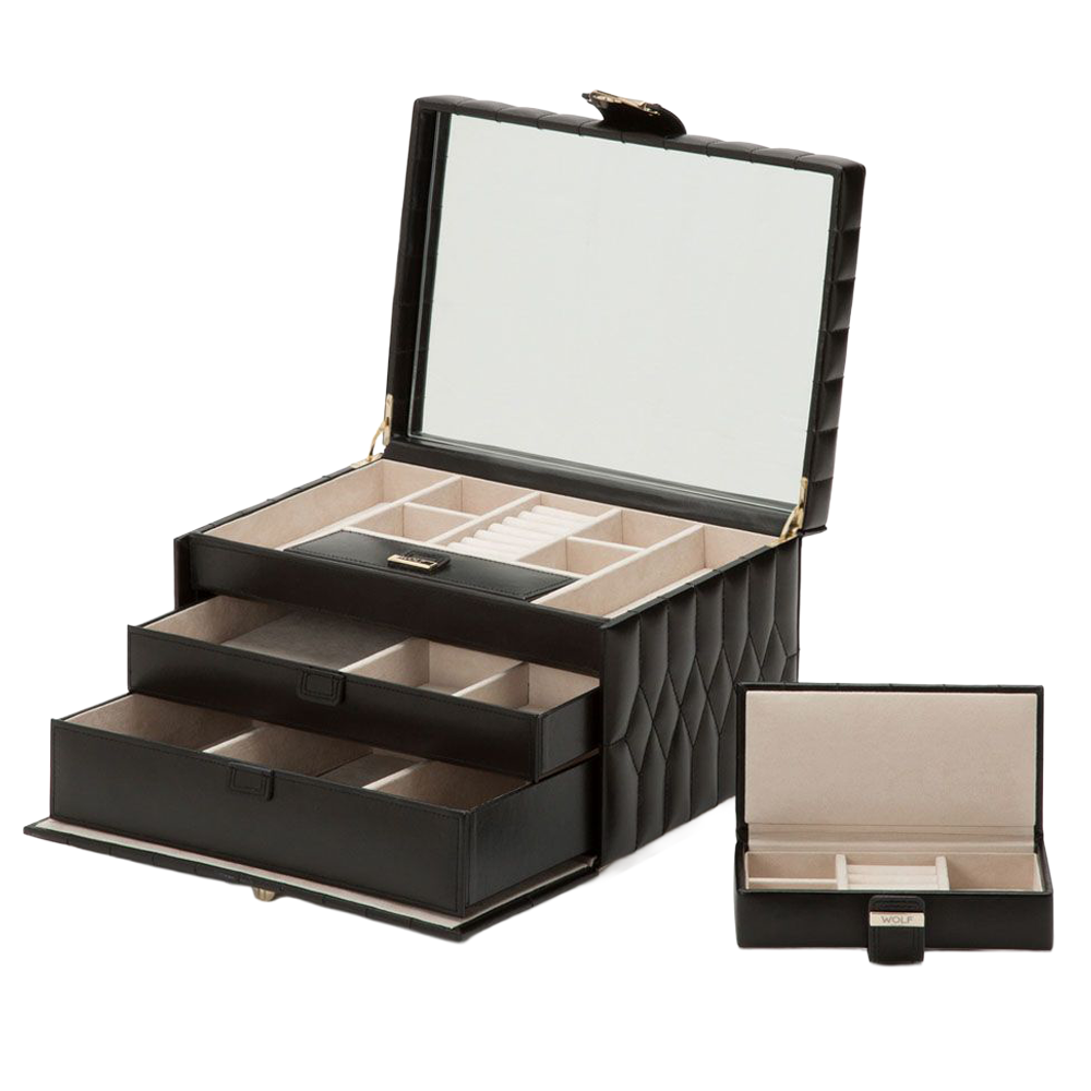 The WOLF Caroline Medium Jewellery Case in black is a timeless classic, inspired by the elegant soft lines of the 1950s. Made from supple, diamond-quilted black leather and finished with gleaming gold-tone hardware, this refined case offers a sophisticated home for your most precious jewellery and heirlooms. Lined with WOLF's patented LusterLoc technology, this fabric absorbs gases that cause tarnishing - helping to prevent it for up to 35 years under typical storage conditions.