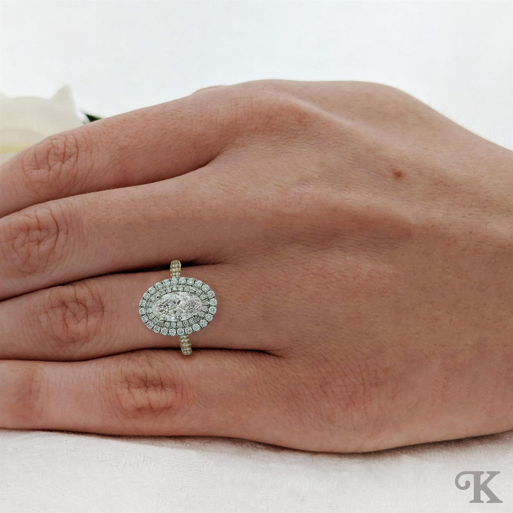 18ct Yellow Gold Shank and Platinum Head Halo Oval cut Diamond engagement ring with scalloped set diamond shoulders. In a Platinum Claw Set on a 18ct Yellow Gold diamond band 1.84ct total E Colour