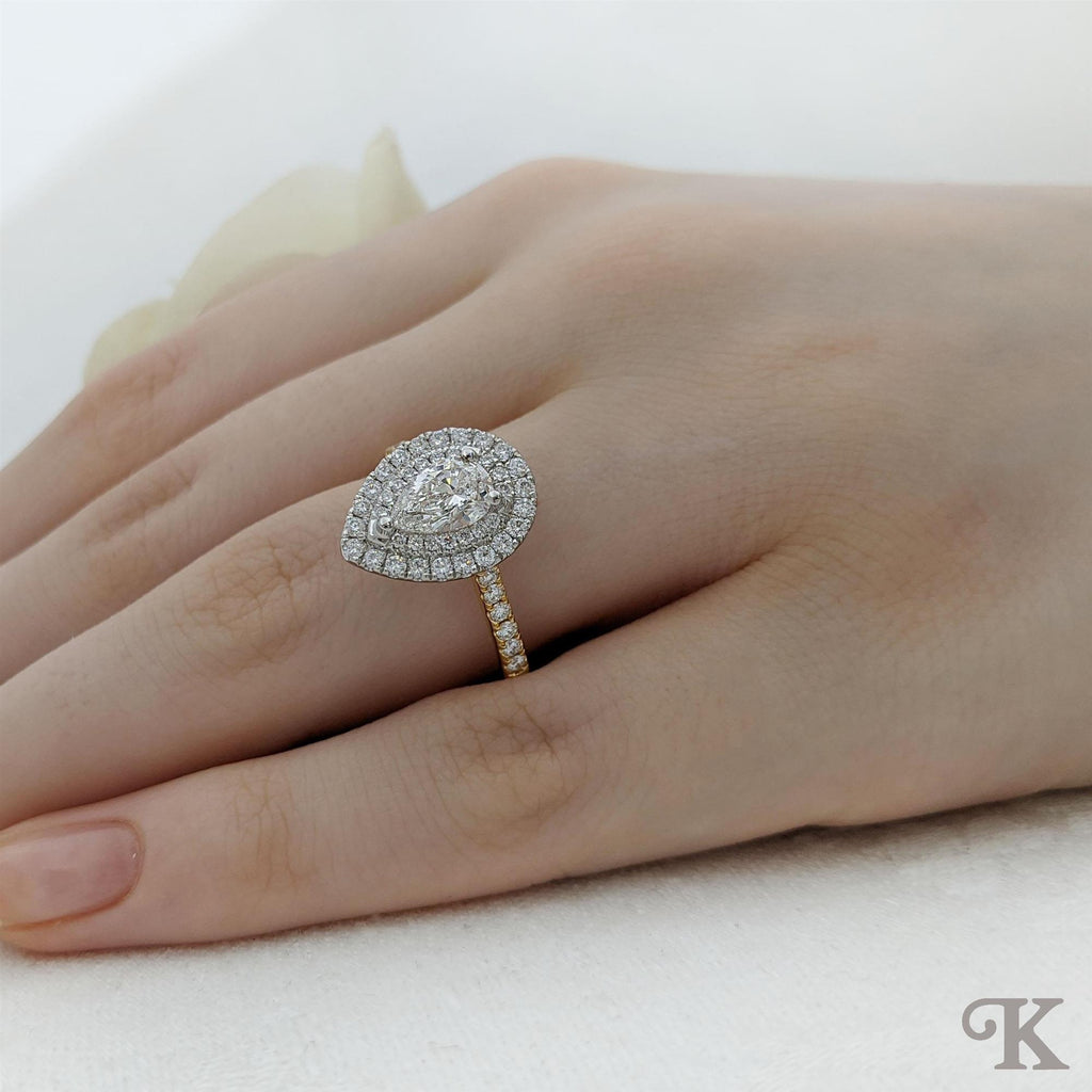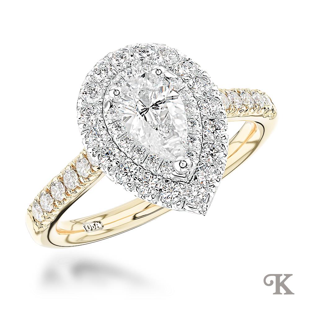 18ct Yellow Gold Shank and Platinum Head Halo Pear cut Diamond engagement ring with scalloped set diamond shoulders. In a Platinum Claw Set on a 18ct Yellow Gold Diamond Band 1.25ct total D Colour