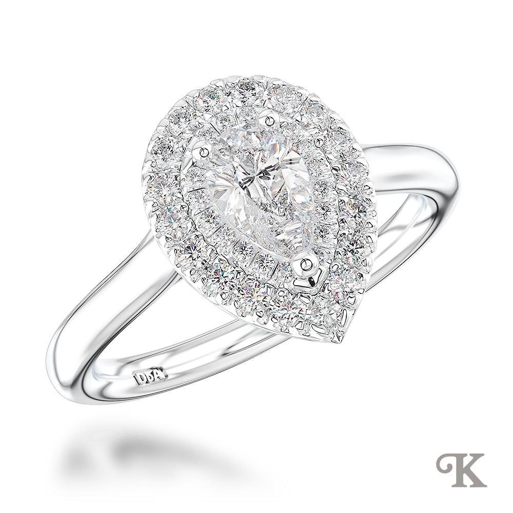 Platinum Halo Cluster Pear cut Diamond engagement ring in a Platinum Claw Set on a Platinum Plain Band 0.84ct total E Colour
