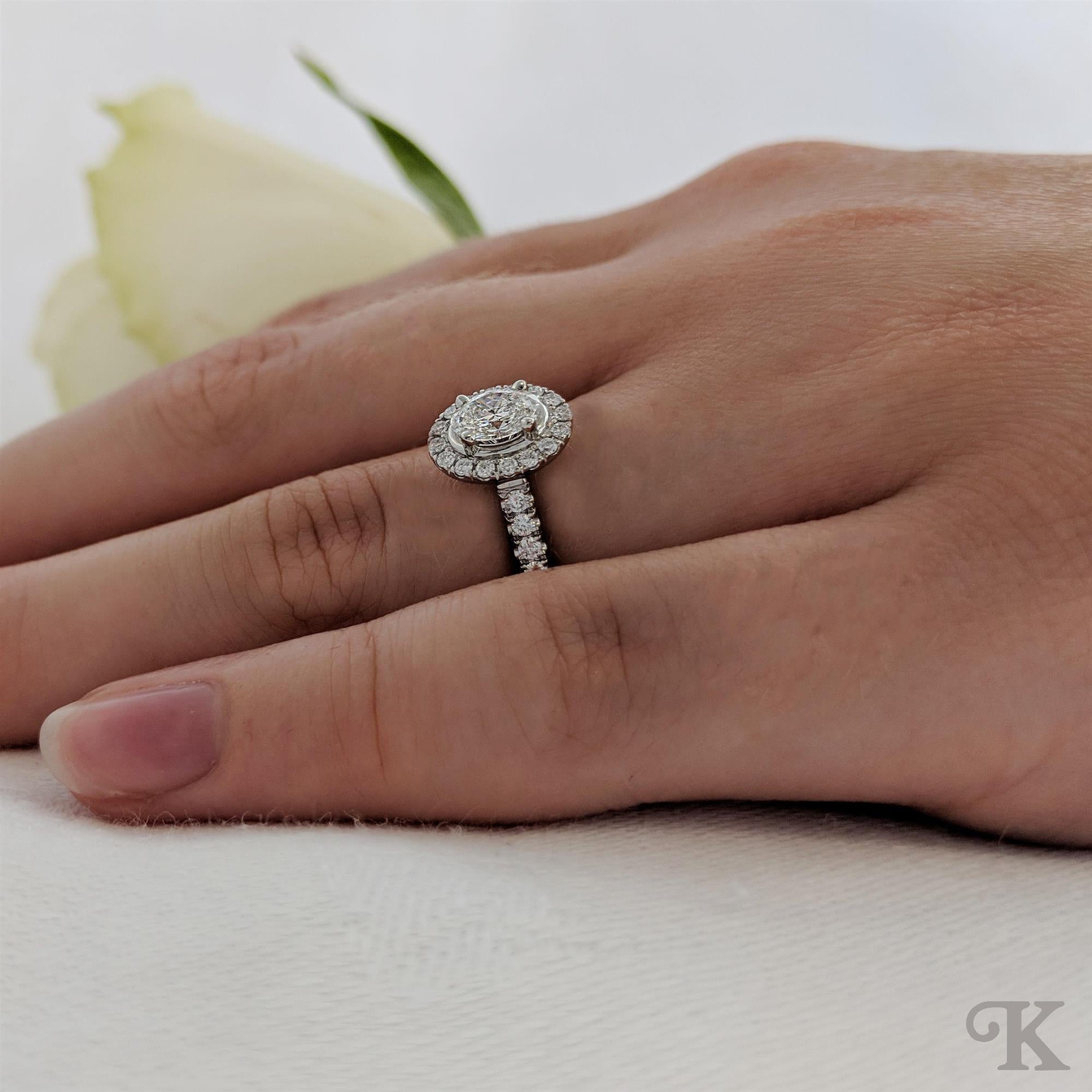 Platinum Halo A Oval cut Diamond and Diamond Cluster surrounded by smaller round brilliant cut diamonds on a Platinum Diamond Band. In a classic scalloped Skye Oval setting 0.71ct total F Colour