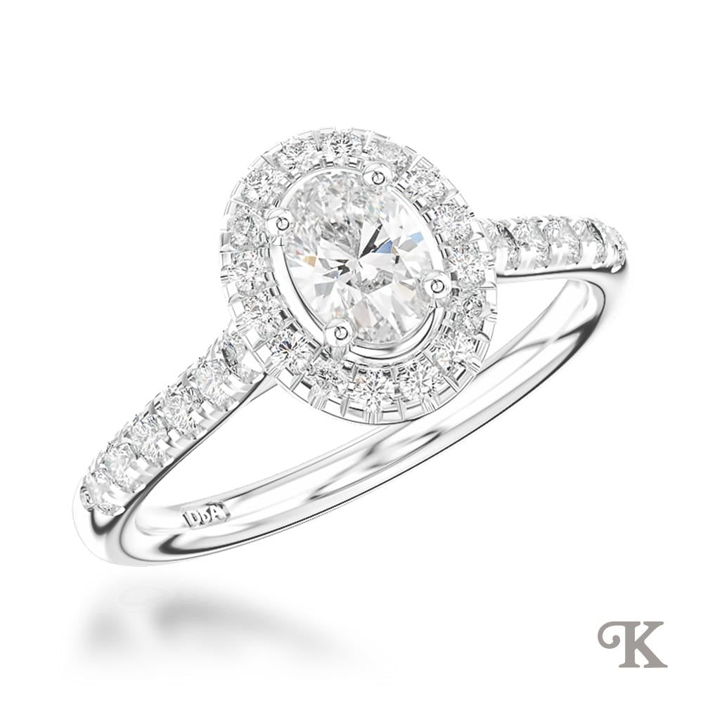 Platinum Halo A Oval cut Diamond and Diamond Cluster surrounded by smaller round brilliant cut diamonds on a Platinum Diamond Band. In a classic scalloped Skye Oval setting 0.57ct total F Colour