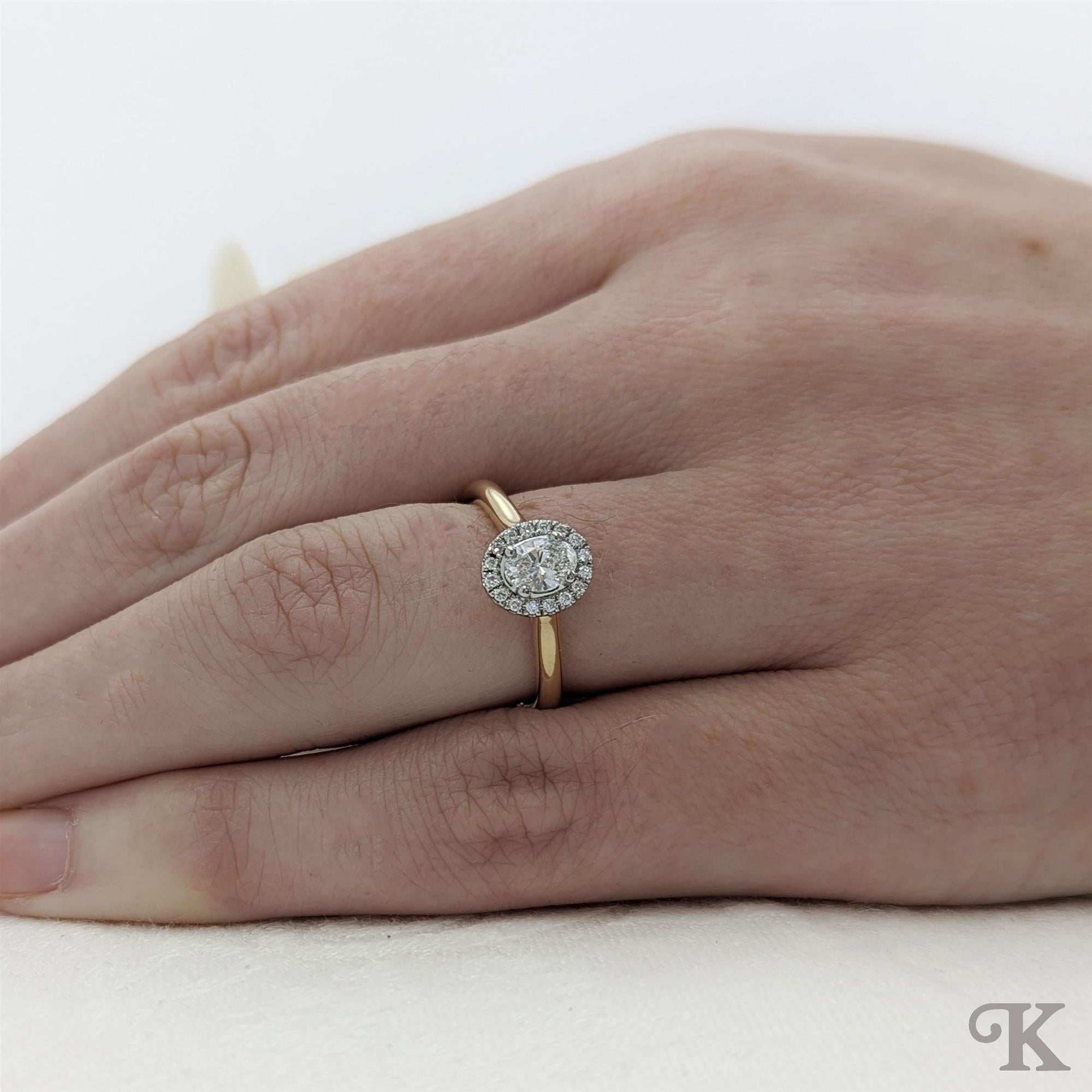 18ct Yellow Gold Shank and Platinum Head Halo A classical solitaire with scalloped set diamonds in the surround. Platinum head with Yellow Gold Shank. A new classic. 0.39ct total G Colour