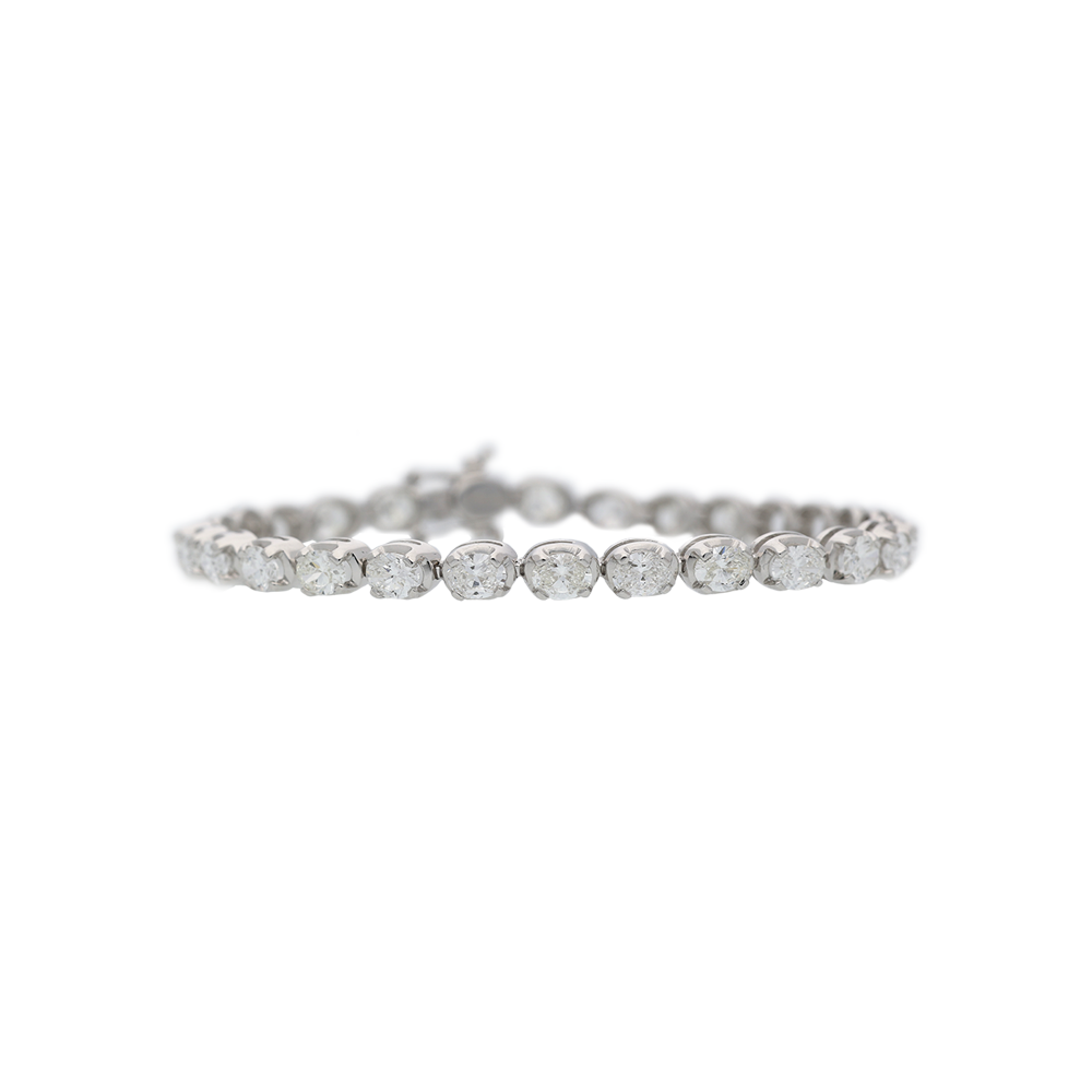 A true statement of elegance, this bracelet embodies luxury and craftsmanship. This remarkable tennis bracelet is made in 18ct white gold and set with large, round brilliant-cut diamonds totalling 9 carats. Each diamond is chosen for its exceptional clarity and brilliance, creating a bold yet timeless display of light along the wrist.