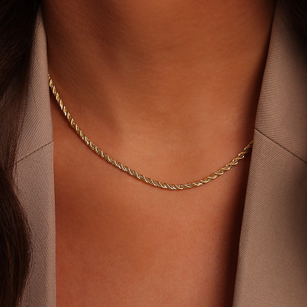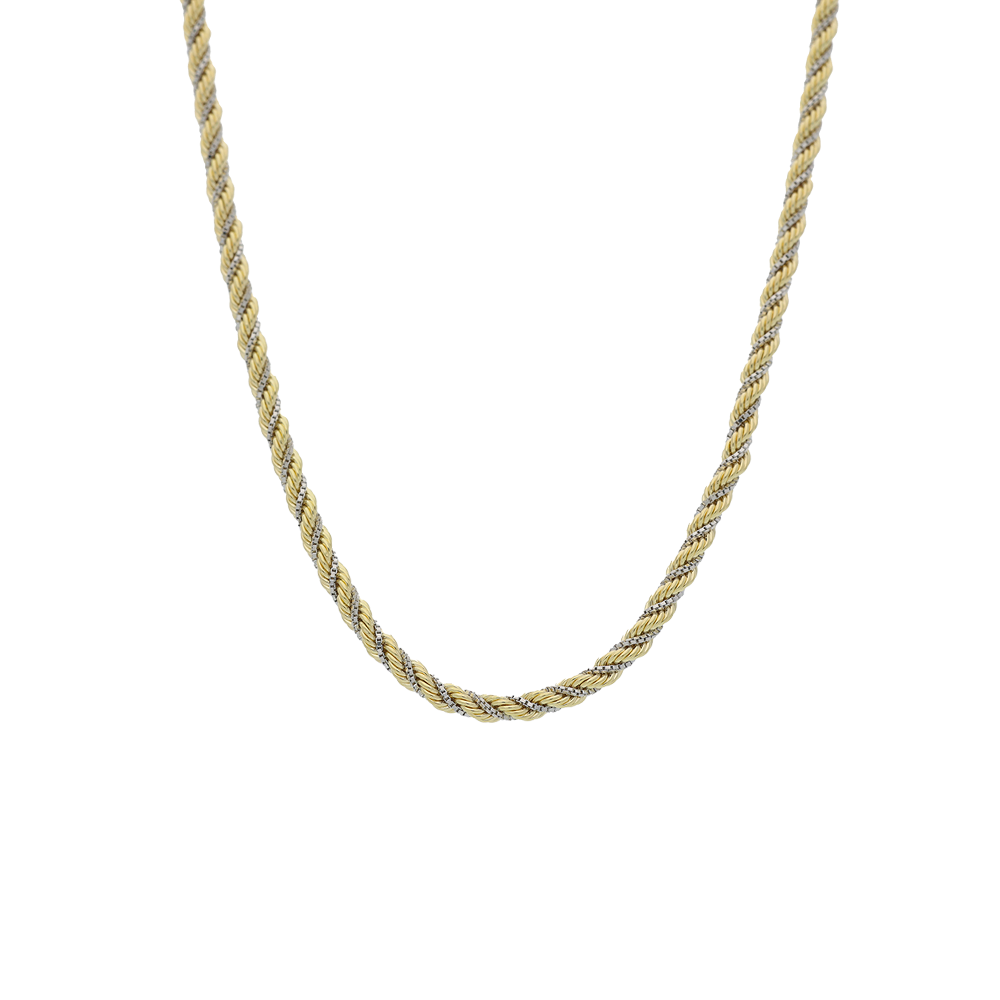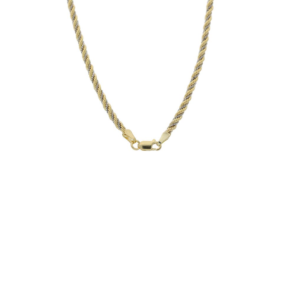 This 9ct yellow and white gold necklace features a striking twisted rope design, combining the warmth of yellow gold with the brilliance of white gold for a timeless two-tone effect. Choose from a 41cm shorter chain, that sits high on the neckline, or a 45cm longer chain, elegantly sitting below your collarbone, catching the light with every movement.