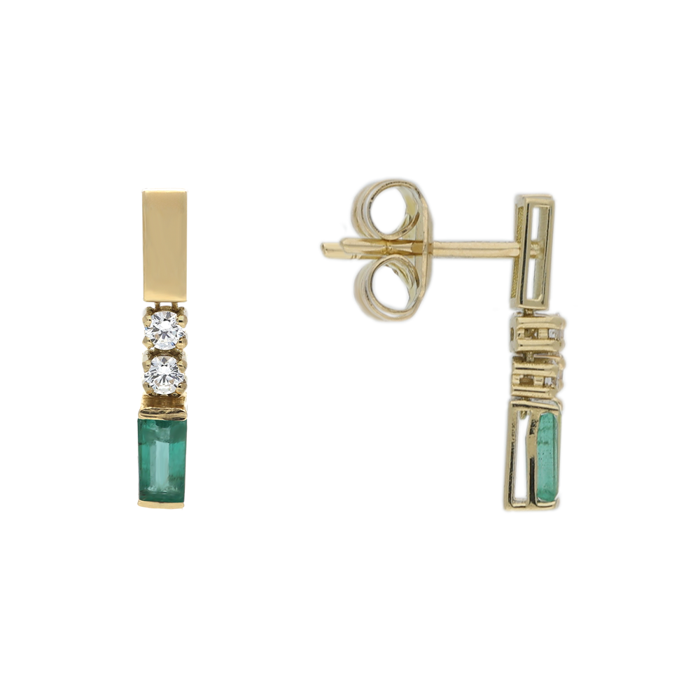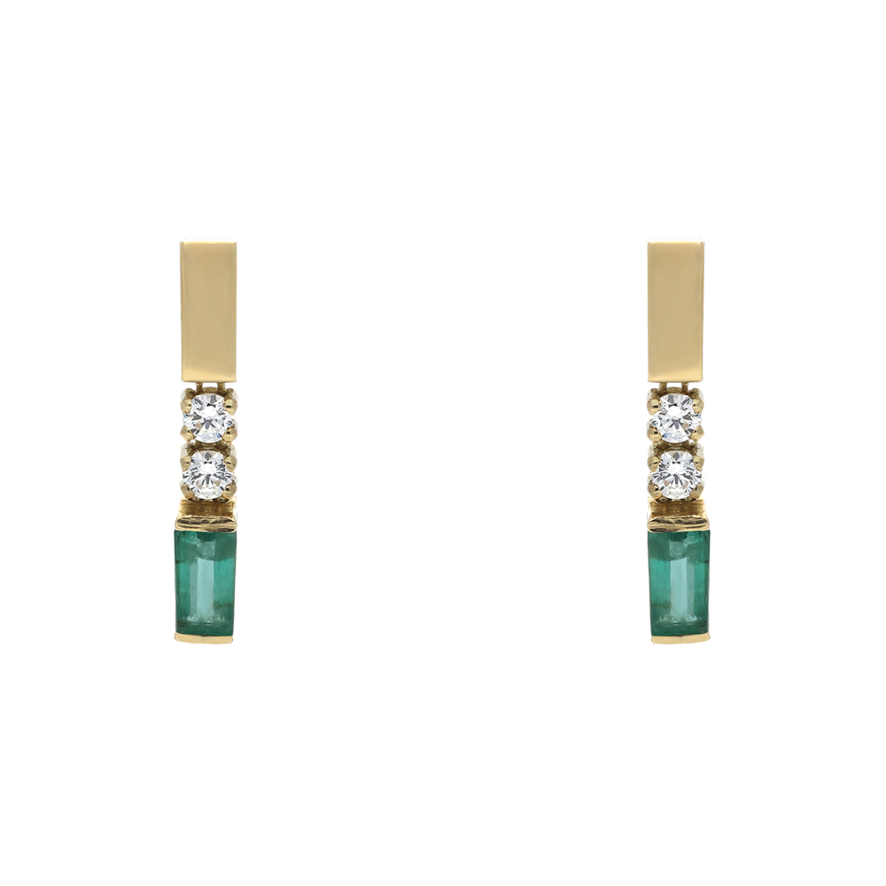 These refined drop earrings are crafted in polished 9ct yellow gold and feature a clean, linear design. Each earring is set with two round brilliant-cut diamonds, positioned above an emerald-green baguette-cut emerald, offering a balanced contrast of sparkle and colour. The vertical silhouette lends a contemporary finish while remaining understated and versatile, suitable for both daytime wear and evening styling.