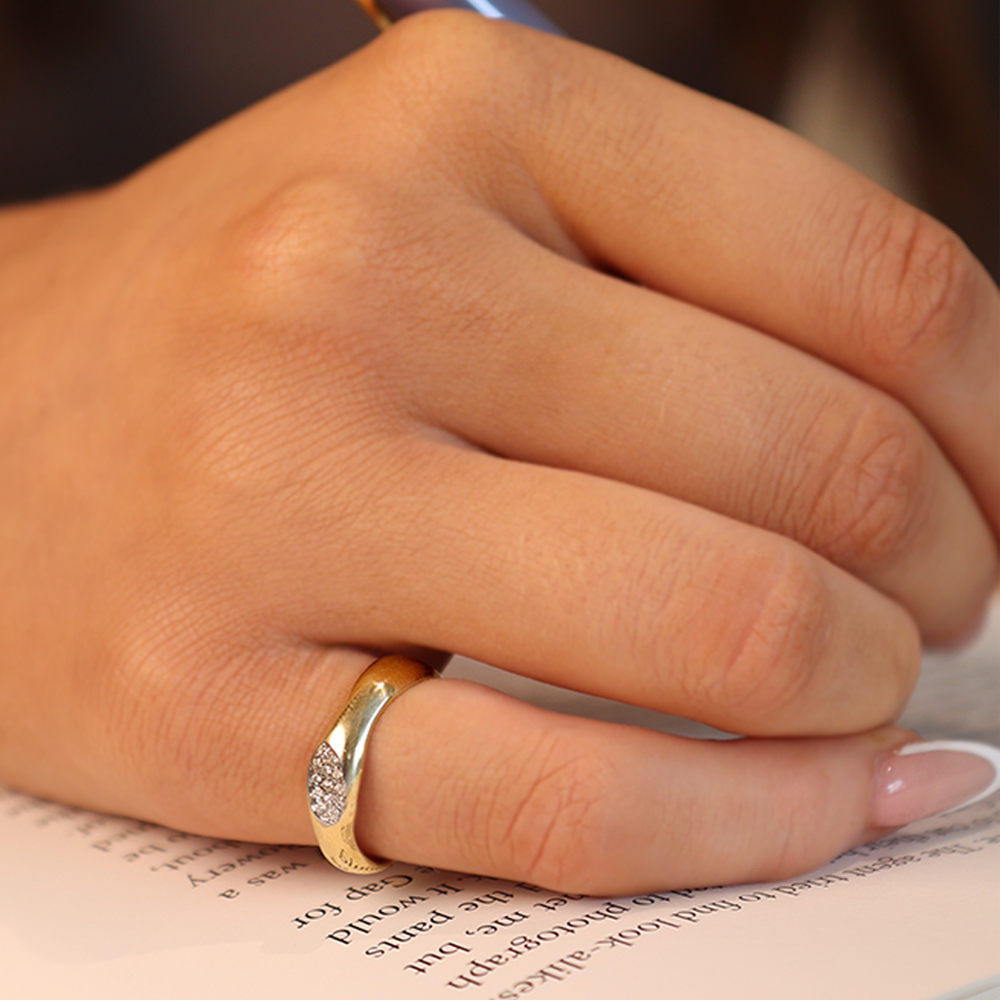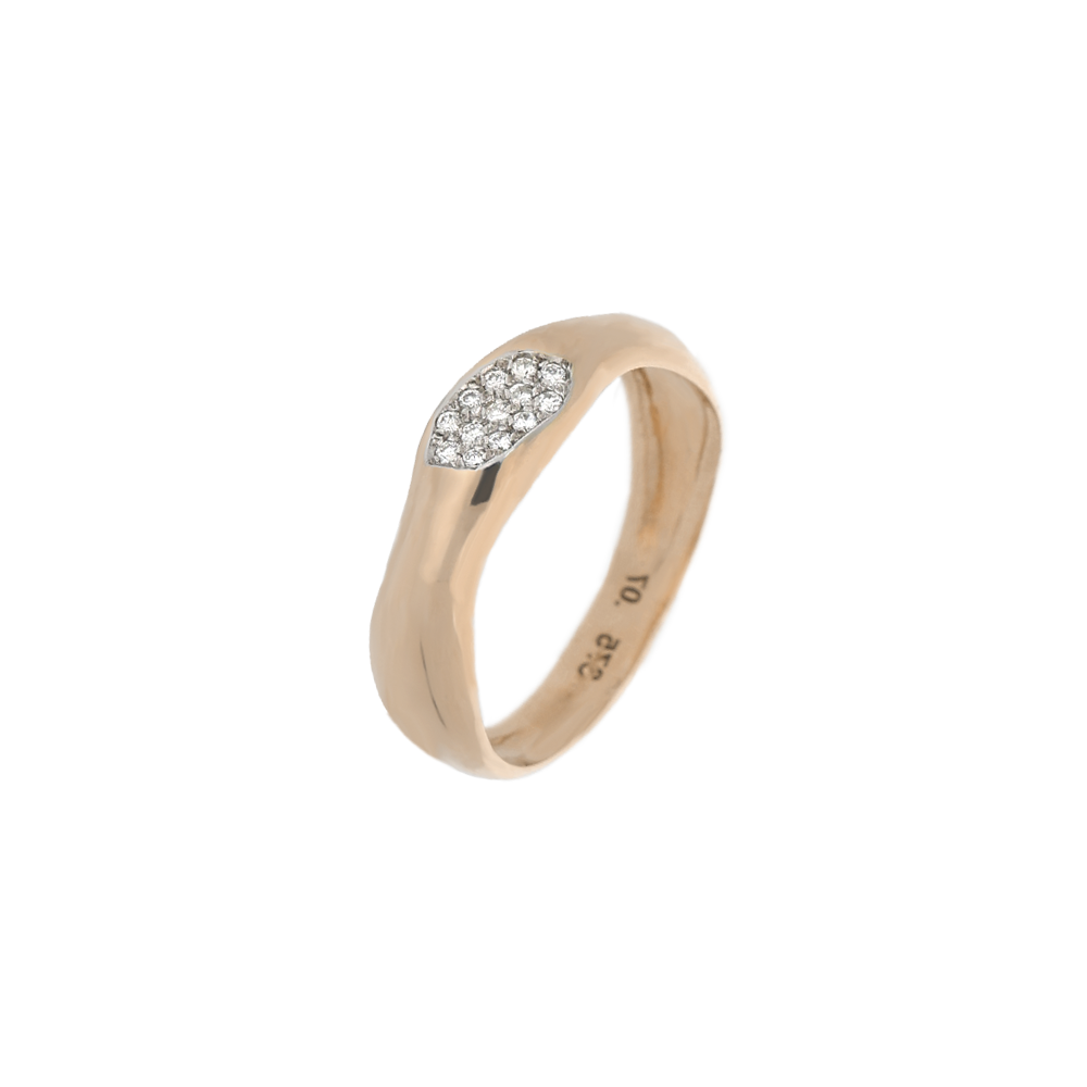 This 9ct gold ring features an elegant wavy design, beautifully enhanced with a sparkling pave diamond setting across the front. The gentle curves of the band create a graceful, flowing silhouette, while the diamonds add brilliance and sophistication.
