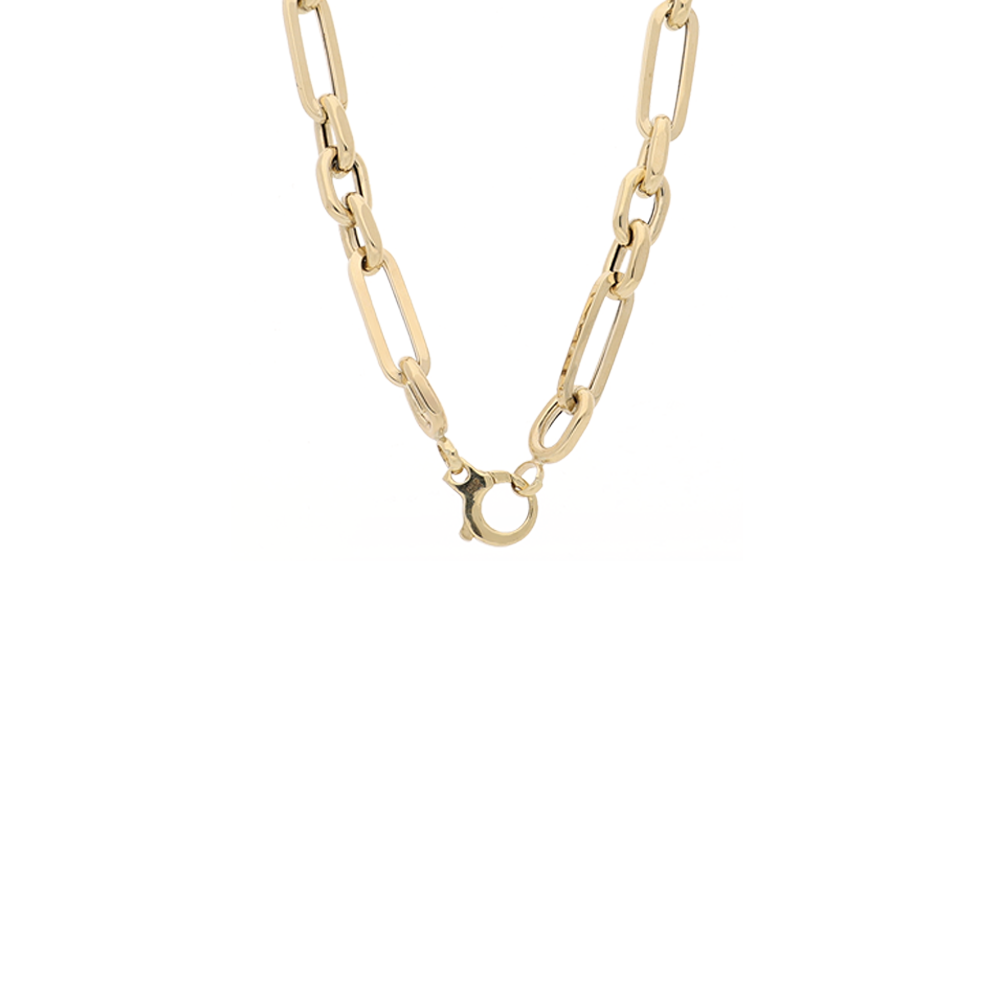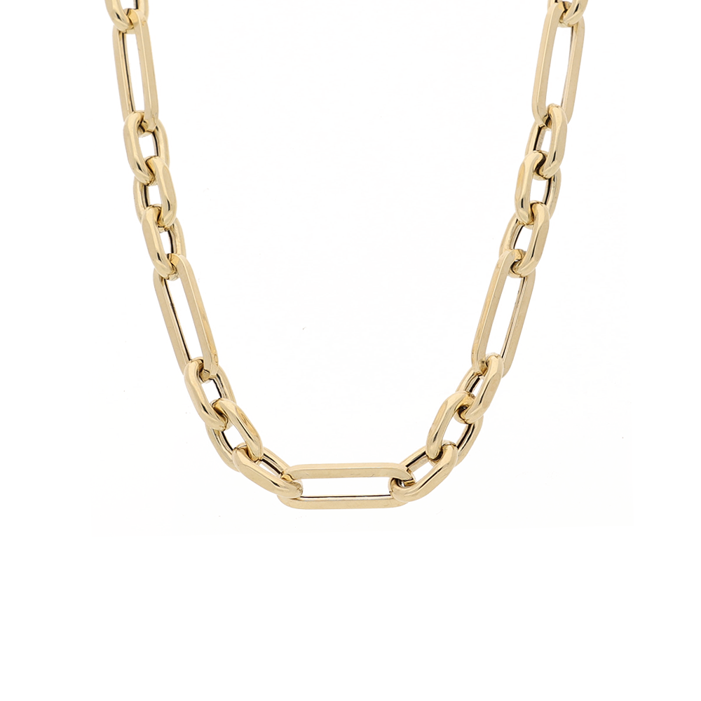 This 9ct yellow gold necklace features an elegant combination of elongated oval links and smaller round links, creating a beautifully balanced and refined design. Measuring 45cm, it sits gracefully along the neckline, with each polished link enhancing the warm golden glow.