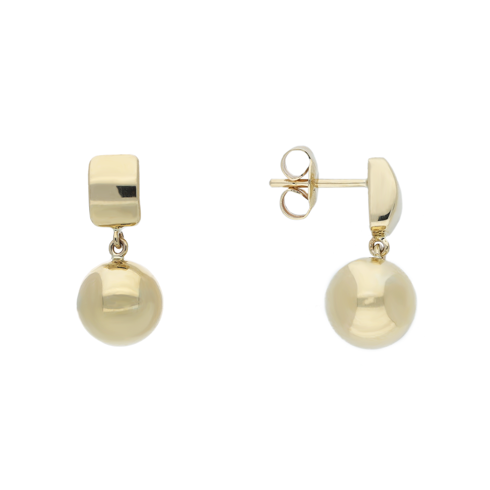 These elegant drop earrings are made in 9ct yellow gold and designed with a contemporary geometric profile. A sleek rectangular gold element sits at the ear, from which an 8mm polished yellow gold ball is suspended, created a refined contrast in shape and form. Finished with secure butterfly backs, this pair offers a modern, understated statement suitable for both day and evening wear.