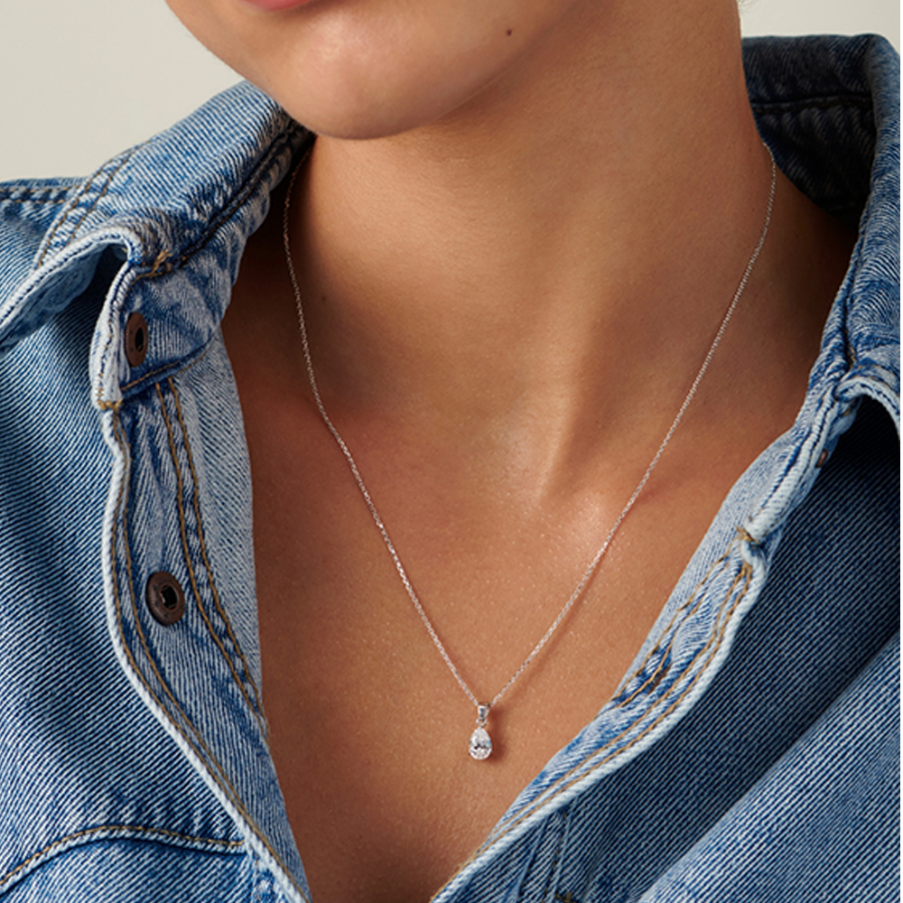 Delicate and captivating, the Cecile Necklace features a solitaire pear-shaped pendant set in 9ct white gold, suspended from a 45cm chain. Its graceful silhouette catches the light beautifully, offering a subtle yet striking touch of elegance, perfect for layering or wearing alone as a timeless statement piece.