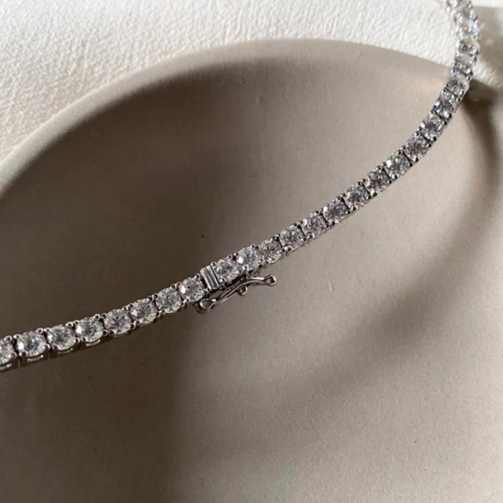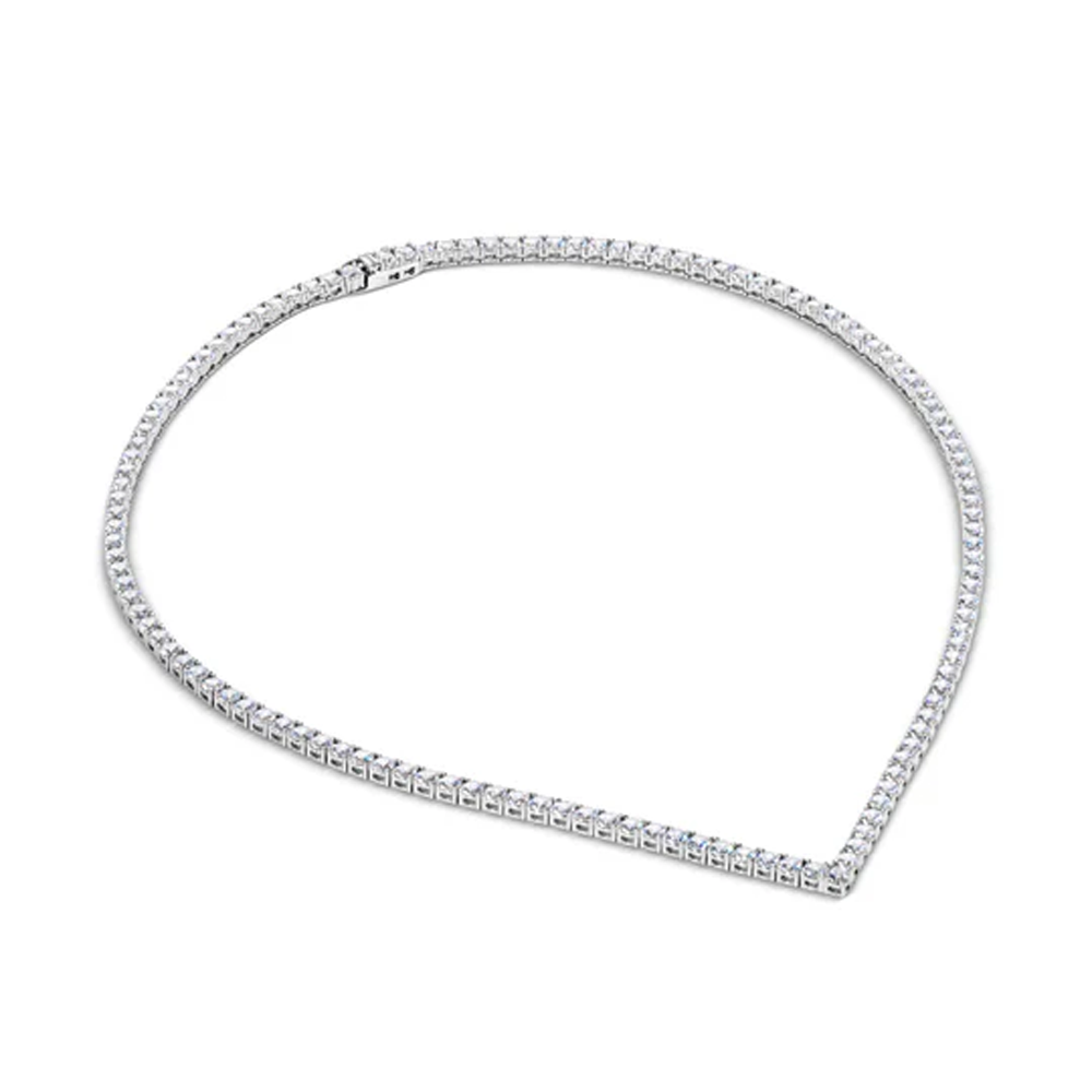 An elegant statement, the Vee Line Tennis Necklace by Carat* London embodies refined femininity. Made in sterling silver and plated with white gold, it features a continuous row of round-cut brilliant stones that gracefully form a distinctive V silhouette. This versatile design sits beautifully along the neckline, pair with minimal drop earrings for a perfectly balanced look.