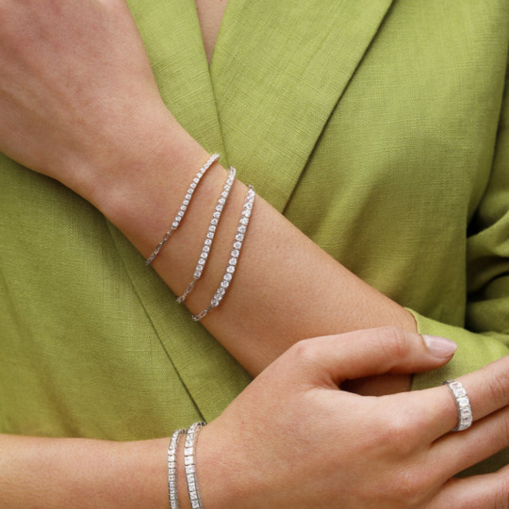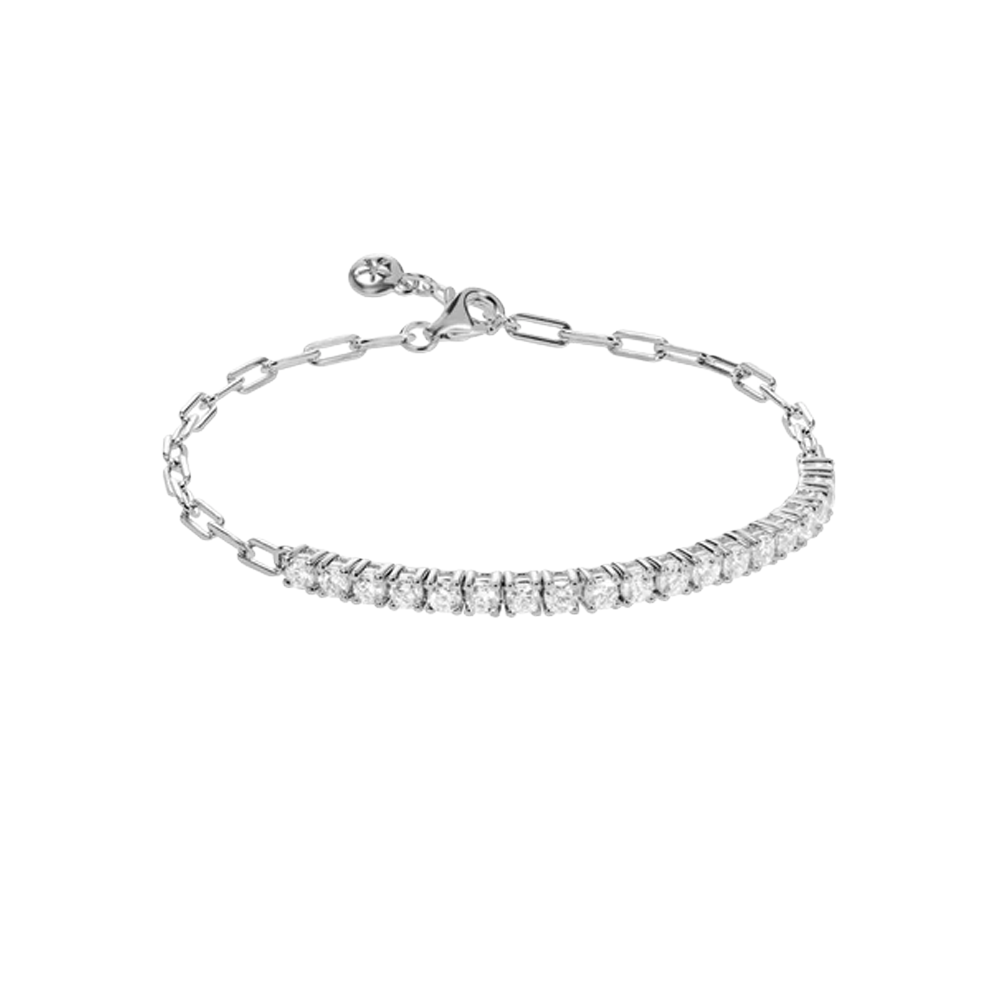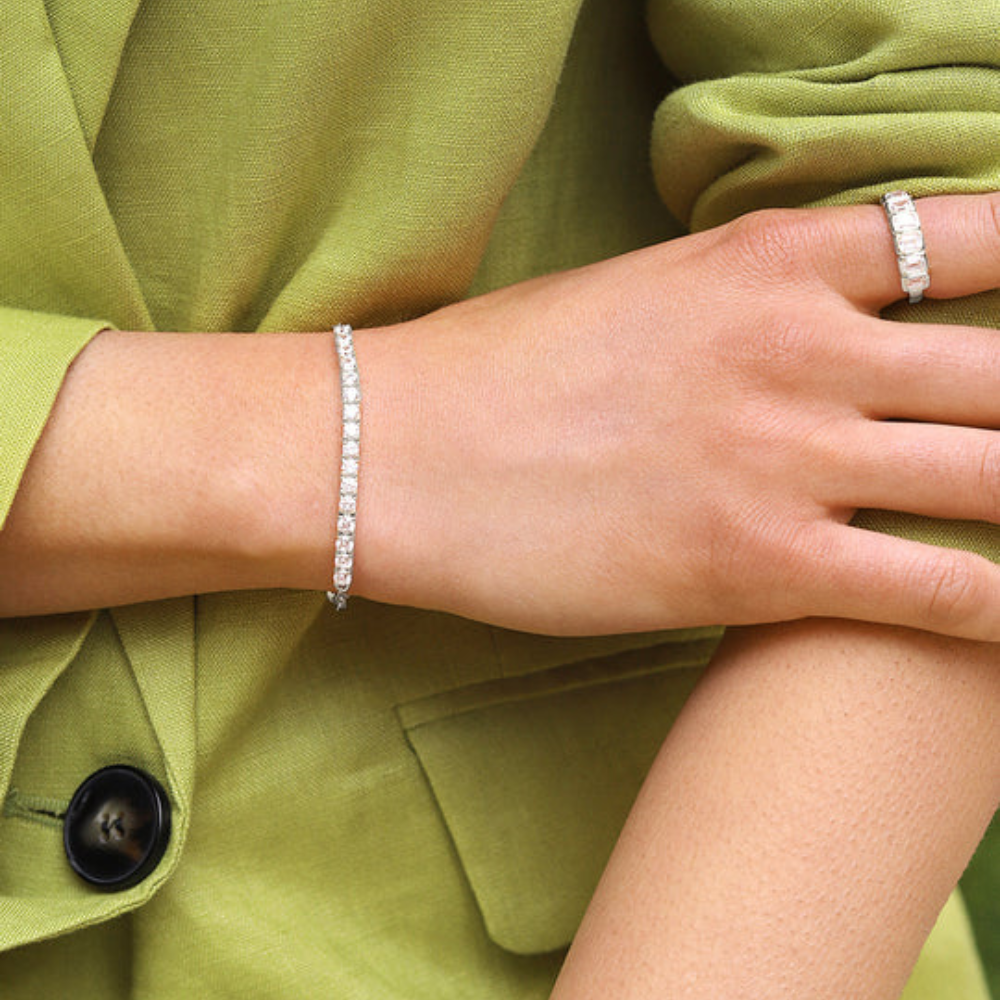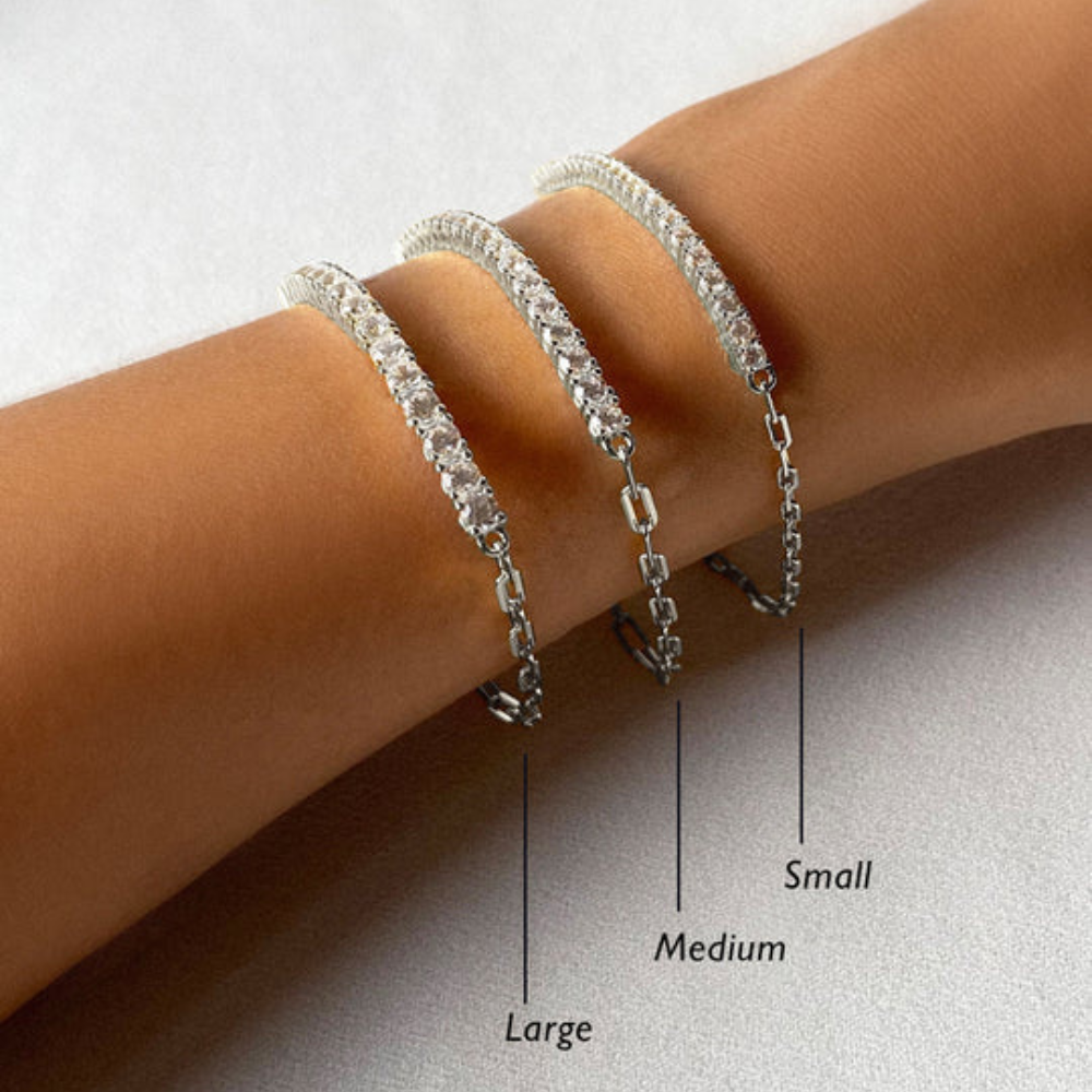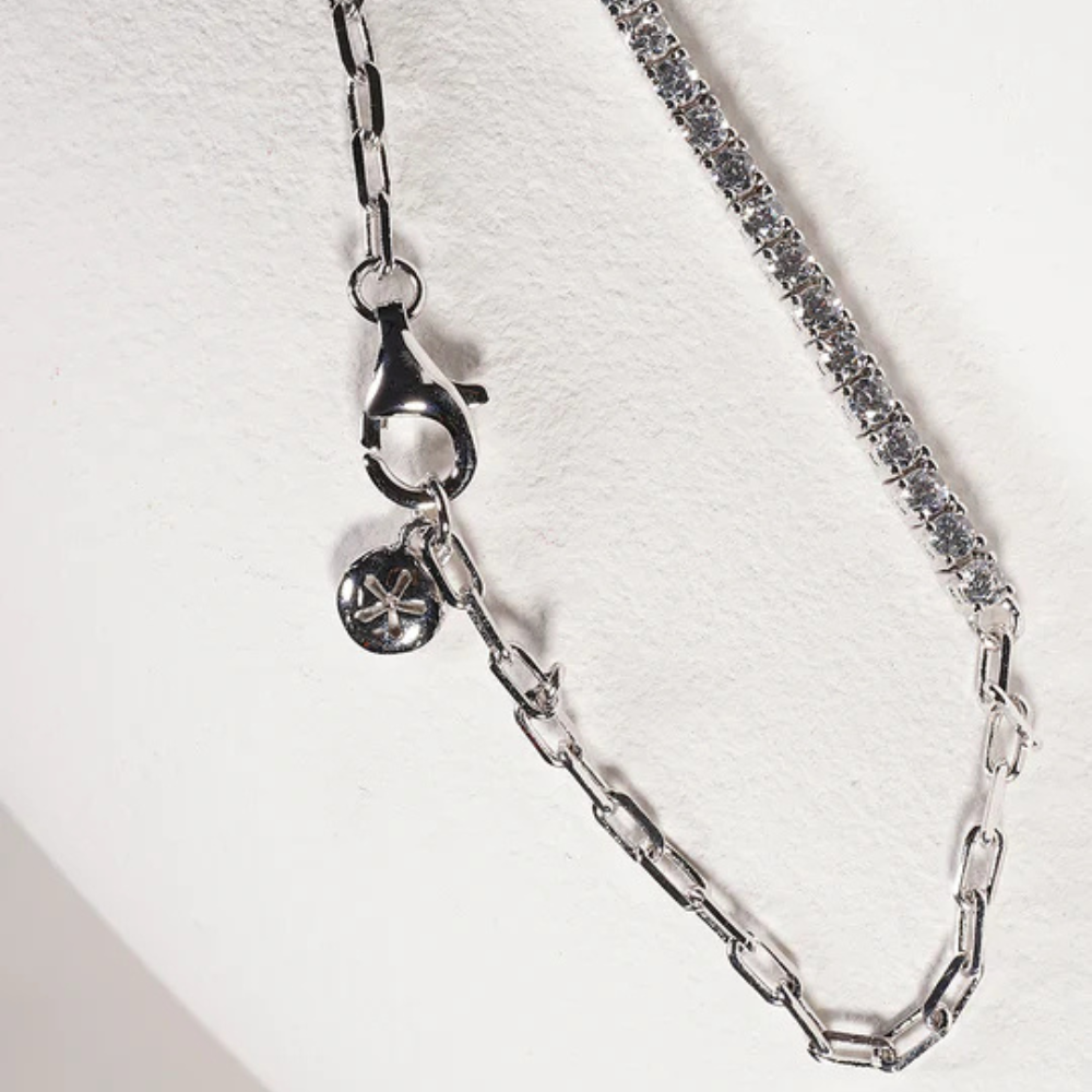 A contemporary reimagining of a timeless classic, the Aimee Tennis Bracelet by Carat* London is made in sterling silver with a radiant white gold plating. This modern design pairs a row of round brilliant stones with a sleek paperclip chain, offering a fresh balance of sparkle and sophistication. Perfect for everyday wear or layered with other bracelets for an elevated, modern look.