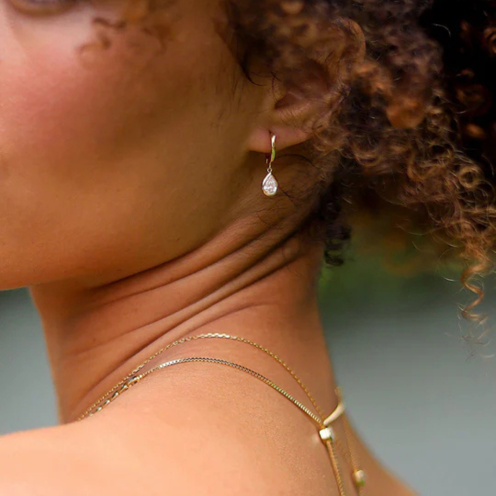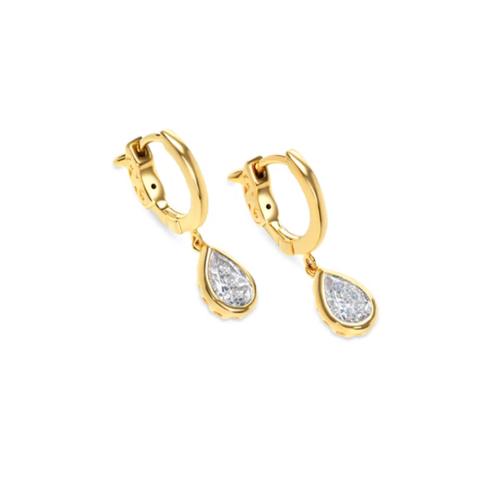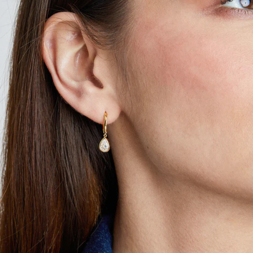 The Danu Hoop Earrings by Carat* London are made in sterling silver with a radiant yellow gold plating. Each graceful hook earring features a pear-shaped cubic zirconia drop, delicately set within a polished gold bezel for a sophisticated finish. Effortlessly versatile, these earrings add a touch of refined sparkle to any look.