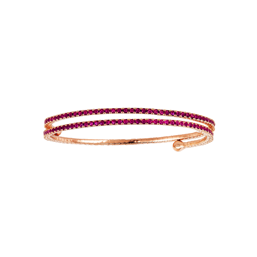 This Gold Plated Sterling Silver Ruby-Red Cubic Zirconia Double Wrap Flexi Bangle offers a warm, luxurious take on the signature wrap silhouette. Finished in rich yellow gold plating, the flexible slip-on design curves fluidly around the wrist in a double-row form. Each row is pave-set with ruby-red cubic zirconia, creating an opulent ribbon of colour that echoes the brilliance of tennis-inspired styling.
